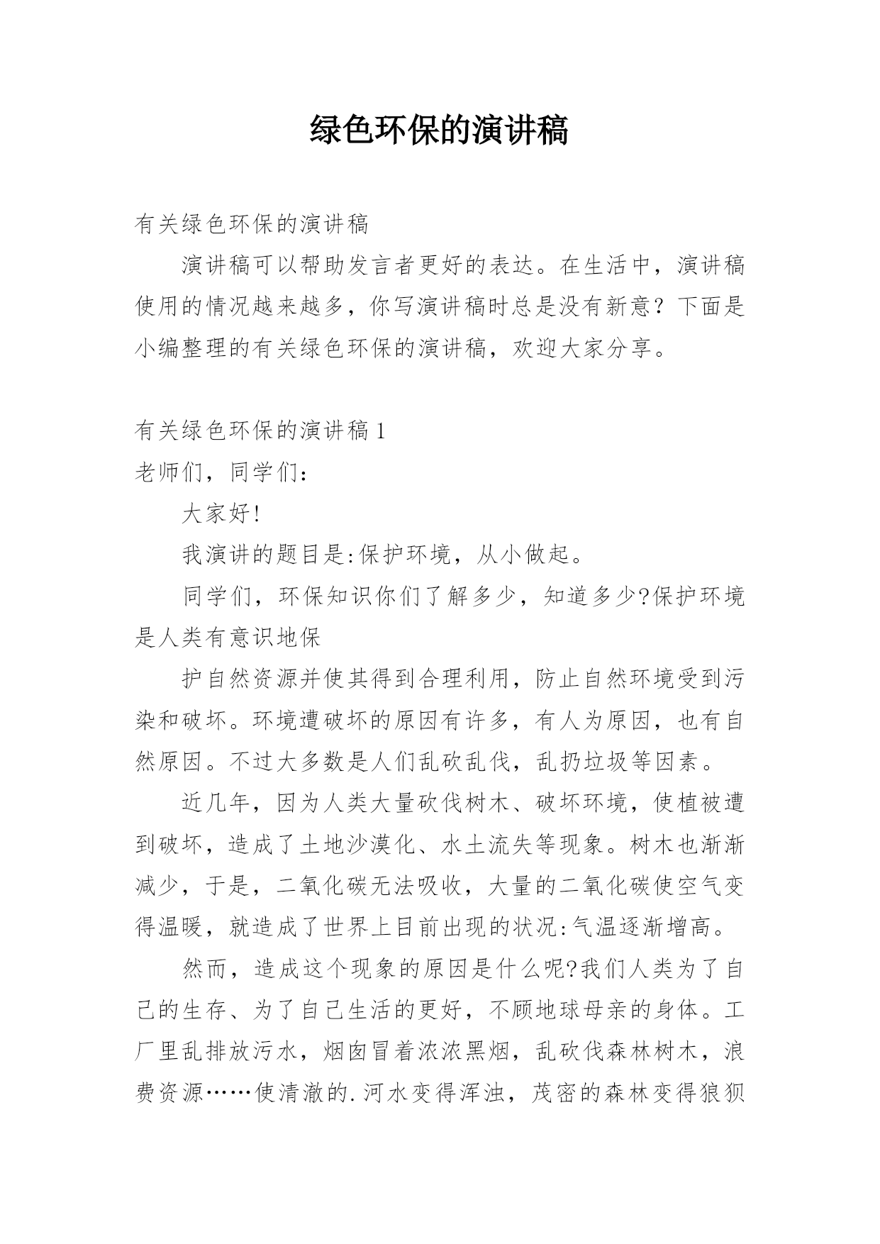 绿色环保的演讲稿有关绿色环保的演讲稿演讲稿可以帮助发言者更好的表达。在生活中,演讲稿使用的情况越来越多,你写演讲稿时总是没有新意?下面是小编整理的有关绿色环保的演讲稿,欢迎大家分享。有关绿色环保的演讲稿1老师们,同学们:大家好!我演讲的题目是:保护环境,从小做起。同学们,环保知识你们了解多少,知道多少?保护环境是人类有意识地保护自然资源并使其得到合理利用,防止自然环境受到污染和破坏。环境遭破坏的原因有许多,有人为原因,也有自然原因。不过大多数是人们乱砍乱伐,乱扔垃圾等因素。近几年,因为人类大量砍伐树木、破