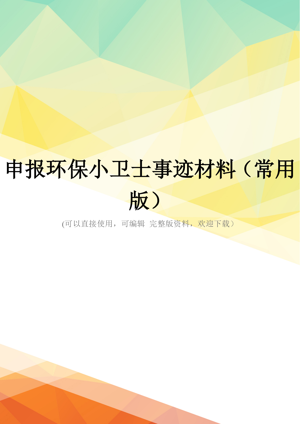 申报环保小卫士事迹材料(常用版)(可以直接使用,可编辑完整版资料,欢迎下载)镇头小学环保小卫士事迹材料“爱护环境,我争先”——记环保小卫士王乐王乐,男,汉族,麟游县镇头小学小学五(4)班学生,班级的劳动委员,也是校、班级环保小组的主要成员。他生活在一个普通职工家庭。他热爱校园,勤劳纯朴,尊老爱幼,乐于助人;他热爱学习,刻苦努力,成绩优秀;他热爱劳动,工作中兢兢业业、以身做责。作为班级的劳动委员,王乐同学每天都是最后一个离开教室的。尽管并不是他值日,他也会主动留下来和同学们一起打扫教室清洁,打扫完他还认认真