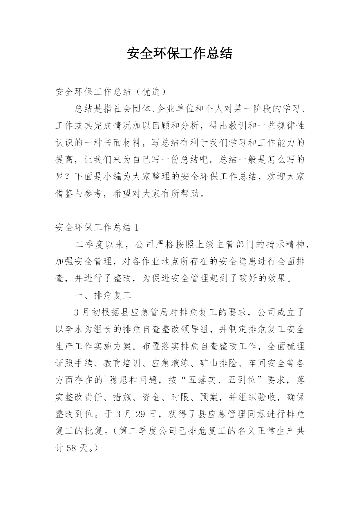 安全环保工作总结安全环保工作总结(优选)总结是指社会团体、企业单位和个人对某一阶段的学习、工作或其完成情况加以回顾和分析,得出教训和一些规律性认识的一种书面材料,写总结有利于我们学习和工作能力的提高,让我们来为自己写一份总结吧。总结一般是怎么写的呢?下面是小编为大家整理的安全环保工作总结,欢迎大家借鉴与参考,希望对大家有所帮助。安全环保工作总结1二季度以来,公司严格按照上级主管部门的指示精神,加强安全管理,对各作业地点所存在的安全隐患进行全面排查,并进行了整改,为促进安全管理起到了较好的效果。一、排危复工