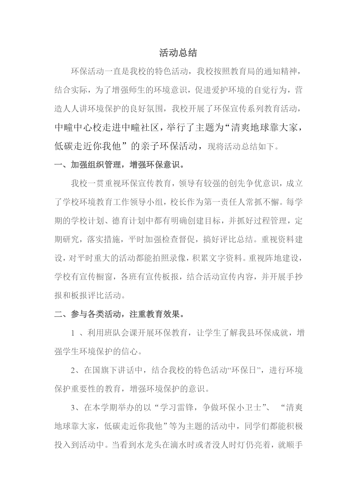 活动总结环保活动一直是我校的特色活动,我校按照教育局的通知精神,结合实际,为了增强师生的环境意识,促进爱护环境的自觉行为,营造人人讲环境保护的良好氛围,我校开展了环保宣传系列教育活动,中疃中心校走进中疃社区,举行了主题为“清爽地球靠大家,低碳走近你我他”的亲子环保活动,现将活动总结如下。一、加强组织管理,增强环保意识。我校一贯重视环保宣传教育,领导有较强的创先争优意识,成立了学校环境教育工作领导小组,校长作为第一责任人常抓不懈。每学期的学校计划、德育计划中都有明确创建目标,并抓好过程管理,定期研究,落实措
