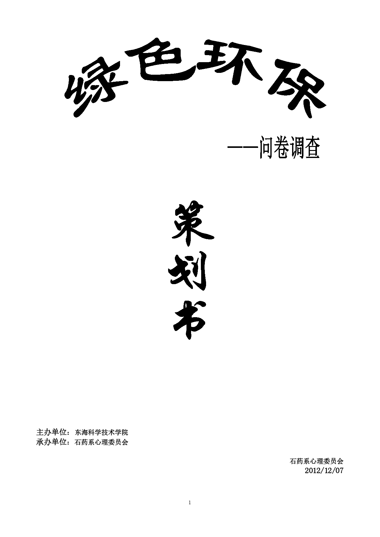 主办单位:东海科学技术学院承办单位:石药系心理委员会石药系心理委员会2012/12/07一、活动背景21世纪,一个经济发达、信息爆发的时代,人们的生活水平有了很大的提高,可环境问题也随之而来。全球环境恶化,物种灭绝、臭氧空洞、江河污染等现象已严重威胁到我们的生命,环保已成人们茶余饭后谈论的焦点。2010年,“低碳”时代宣告到来,全球各地掀起一股“低碳风”。随着全球自然灾害的频频发生,“低碳环保”刻不容缓。为了提高大学生对环境问题的重视程度,从身边小事做起,环保协会借着这股流行风,倡导大家开创思维,把创新带