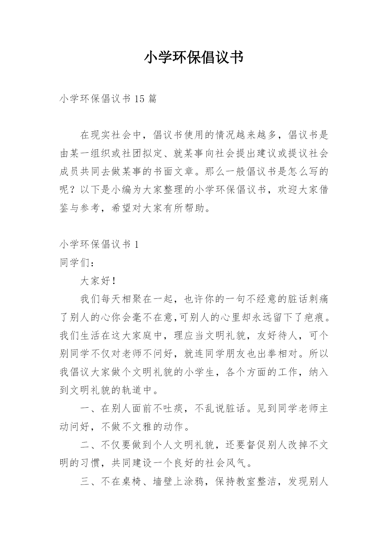 小学环保倡议书小学环保倡议书15篇在现实社会中,倡议书使用的情况越来越多,倡议书是由某一组织或社团拟定、就某事向社会提出建议或提议社会成员共同去做某事的书面文章。那么一般倡议书是怎么写的呢?以下是小编为大家整理的小学环保倡议书,欢迎大家借鉴与参考,希望对大家有所帮助。小学环保倡议书1同学们:大家好!我们每天相聚在一起,也许你的一句不经意的脏话刺痛了别人的心你会毫不在意,可别人的心里却永远留下了疤痕。我们生活在这大家庭中,理应当文明礼貌,友好待人,可个别同学不仅对老师不问好,就连同学朋友也出拳相对。所以我倡