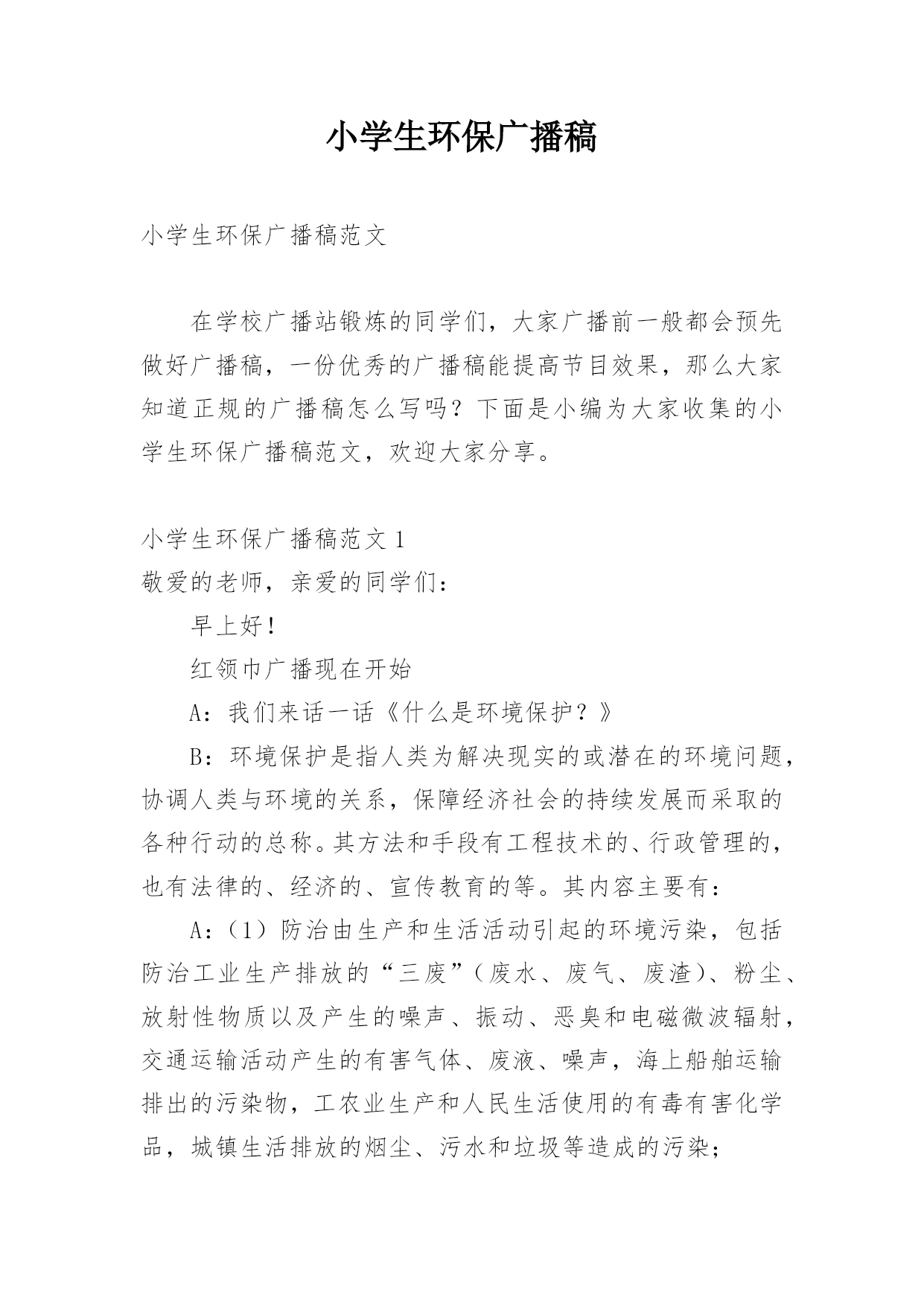小学生环保广播稿小学生环保广播稿范文在学校广播站锻炼的同学们,大家广播前一般都会预先做好广播稿,一份优秀的广播稿能提高节目效果,那么大家知道正规的广播稿怎么写吗?下面是小编为大家收集的小学生环保广播稿范文,欢迎大家分享。小学生环保广播稿范文1敬爱的老师,亲爱的同学们:早上好!红领巾广播现在开始A:我们来话一话《什么是环境保护?》B:环境保护是指人类为解决现实的或潜在的环境问题,协调人类与环境的关系,保障经济社会的持续发展而采取的各种行动的总称。其方法和手段有工程技术的、行政管理的,也有法律的、经济的、宣传