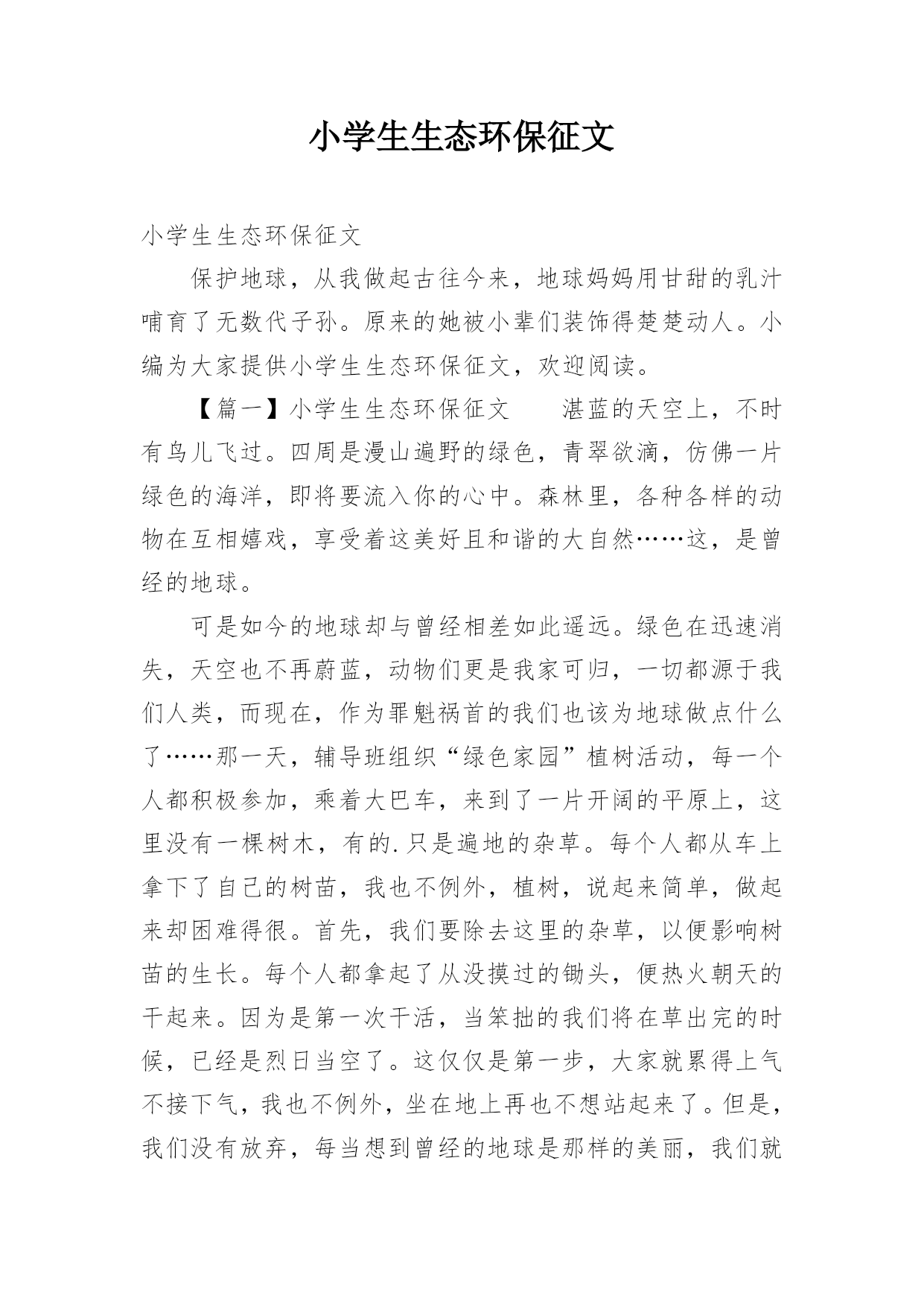 小学生生态环保征文小学生生态环保征文保护地球,从我做起古往今来,地球妈妈用甘甜的乳汁哺育了无数代子孙。原来的她被小辈们装饰得楚楚动人。小编为大家提供小学生生态环保征文,欢迎阅读。【篇一】小学生生态环保征文湛蓝的天空上,不时有鸟儿飞过。四周是漫山遍野的绿色,青翠欲滴,仿佛一片绿色的海洋,即将要流入你的心中。森林里,各种各样的动物在互相嬉戏,享受着这美好且和谐的大自然……这,是曾经的地球。可是如今的地球却与曾经相差如此遥远。绿色在迅速消失,天空也不再蔚蓝,动物们更是我家可归,一切都源于我们人类,而现在,作为罪