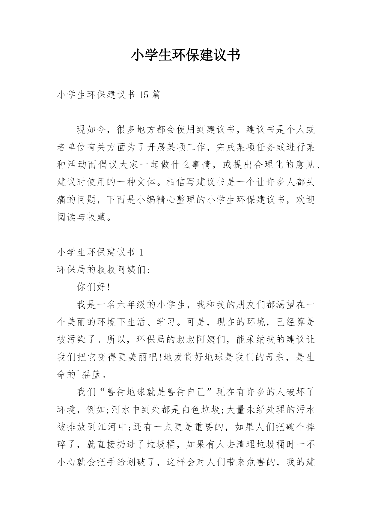 小学生环保建议书小学生环保建议书15篇现如今,很多地方都会使用到建议书,建议书是个人或者单位有关方面为了开展某项工作,完成某项任务或进行某种活动而倡议大家一起做什么事情,或提出合理化的意见、建议时使用的一种文体。相信写建议书是一个让许多人都头痛的问题,下面是小编精心整理的小学生环保建议书,欢迎阅读与收藏。小学生环保建议书1环保局的叔叔阿姨们;你们好!我是一名六年级的小学生,我和我的朋友们都渴望在一个美丽的环境下生活、学习。可是,现在的环境,已经算是被污染了。所以,环保局的叔叔阿姨们,能采纳我的建议让我们把