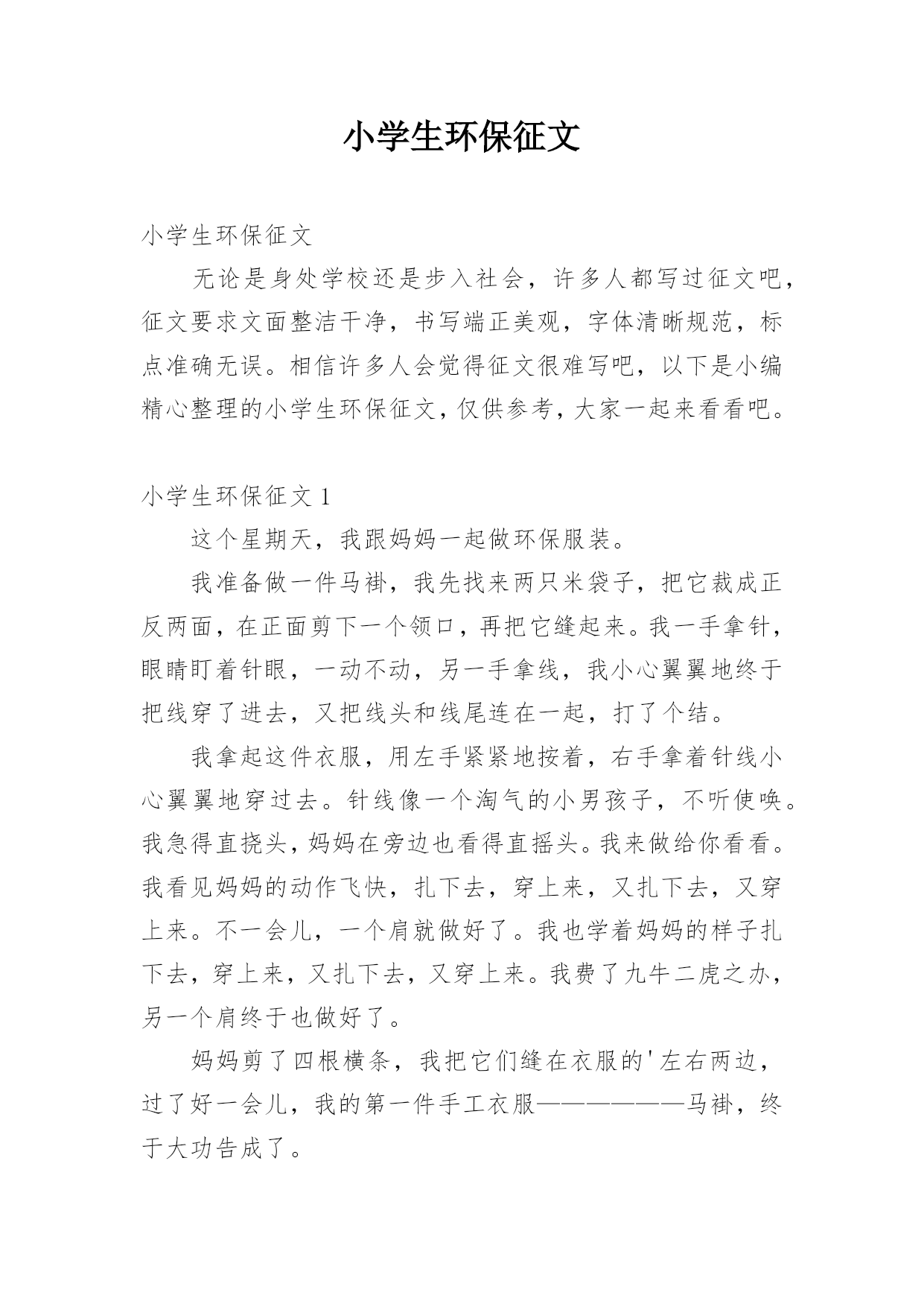 小学生环保征文小学生环保征文无论是身处学校还是步入社会,许多人都写过征文吧,征文要求文面整洁干净,书写端正美观,字体清晰规范,标点准确无误。相信许多人会觉得征文很难写吧,以下是小编精心整理的小学生环保征文,仅供参考,大家一起来看看吧。小学生环保征文1这个星期天,我跟妈妈一起做环保服装。我准备做一件马褂,我先找来两只米袋子,把它裁成正反两面,在正面剪下一个领口,再把它缝起来。我一手拿针,眼睛盯着针眼,一动不动,另一手拿线,我小心翼翼地终于把线穿了进去,又把线头和线尾连在一起,打了个结。我拿起这件衣服,用左手