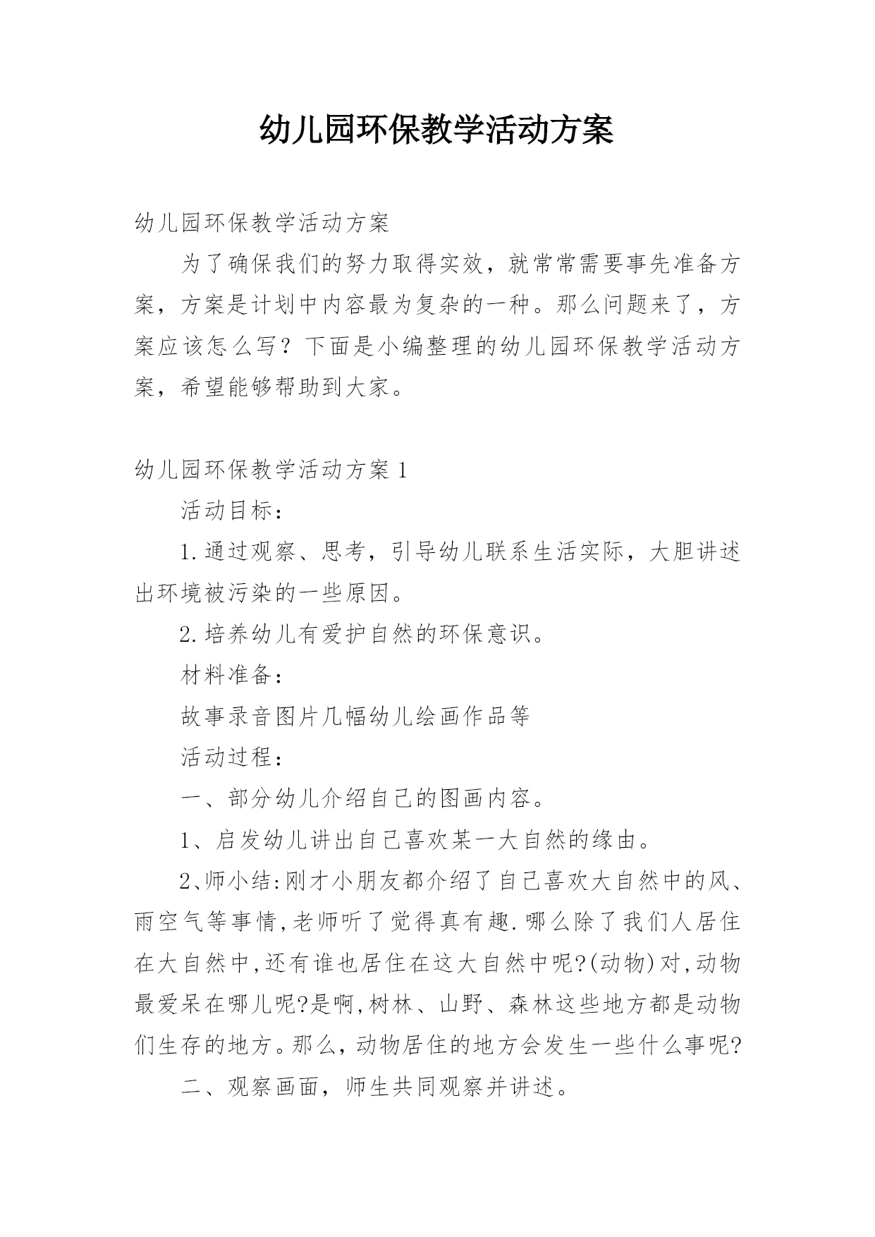 幼儿园环保教学活动方案幼儿园环保教学活动方案为了确保我们的努力取得实效,就常常需要事先准备方案,方案是计划中内容最为复杂的一种。那么问题来了,方案应该怎么写?下面是小编整理的幼儿园环保教学活动方案,希望能够帮助到大家。幼儿园环保教学活动方案1活动目标:1.通过观察、思考,引导幼儿联系生活实际,大胆讲述出环境被污染的一些原因。2.培养幼儿有爱护自然的环保意识。材料准备:故事录音图片几幅幼儿绘画作品等活动过程:一、部分幼儿介绍自己的图画内容。1、启发幼儿讲出自己喜欢某一大自然的缘由。2、师小结:刚才小朋友都介