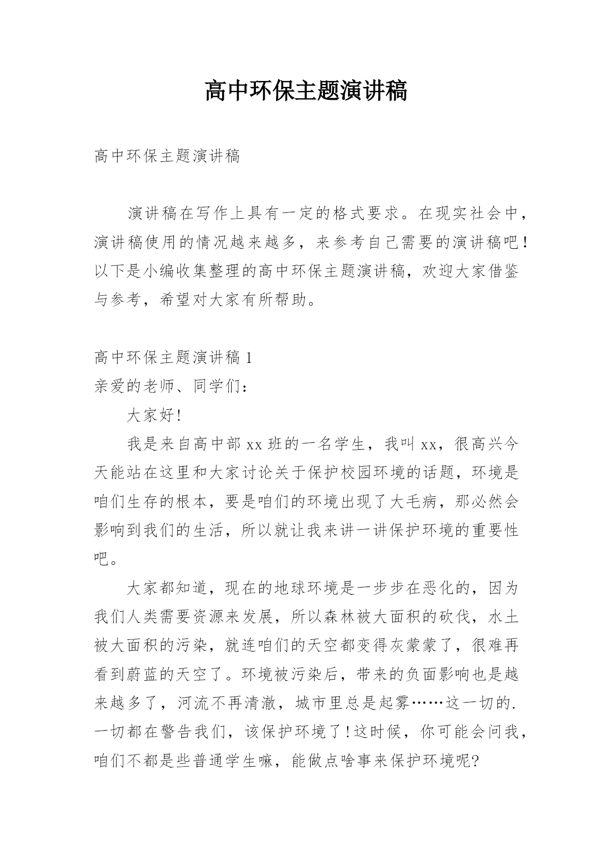 高中环保主题演讲稿高中环保主题演讲稿演讲稿在写作上具有一定的格式要求。在现实社会中,演讲稿使用的情况越来越多,来参考自己需要的演讲稿吧!以下是小编收集整理的高中环保主题演讲稿,欢迎大家借鉴与参考,希望对大家有所帮助。高中环保主题演讲稿1亲爱的老师、同学们:大家好!我是来自高中部xx班的一名学生,我叫xx,很高兴今天能站在这里和大家讨论关于保护校园环境的话题,环境是咱们生存的根本,要是咱们的环境出现了大毛病,那必然会影响到我们的生活,所以就让我来讲一讲保护环境的重要性吧。大家都知道,现在的地球环境是一步步在