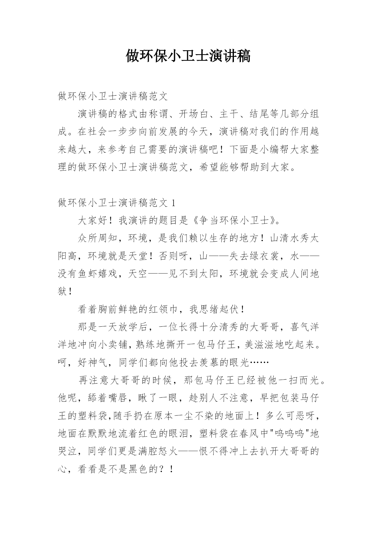 做环保小卫士演讲稿做环保小卫士演讲稿范文演讲稿的格式由称谓、开场白、主干、结尾等几部分组成。在社会一步步向前发展的今天,演讲稿对我们的作用越来越大,来参考自己需要的演讲稿吧!下面是小编帮大家整理的做环保小卫士演讲稿范文,希望能够帮助到大家。做环保小卫士演讲稿范文1大家好!我演讲的题目是《争当环保小卫士》。众所周知,环境,是我们赖以生存的地方!山清水秀太阳高,环境就是天堂!否则呀,山——失去绿衣裳,水——没有鱼虾嬉戏,天空——见不到太阳,环境就会变成人间地狱!看着胸前鲜艳的红领巾,我思绪起伏!那是一天放学后