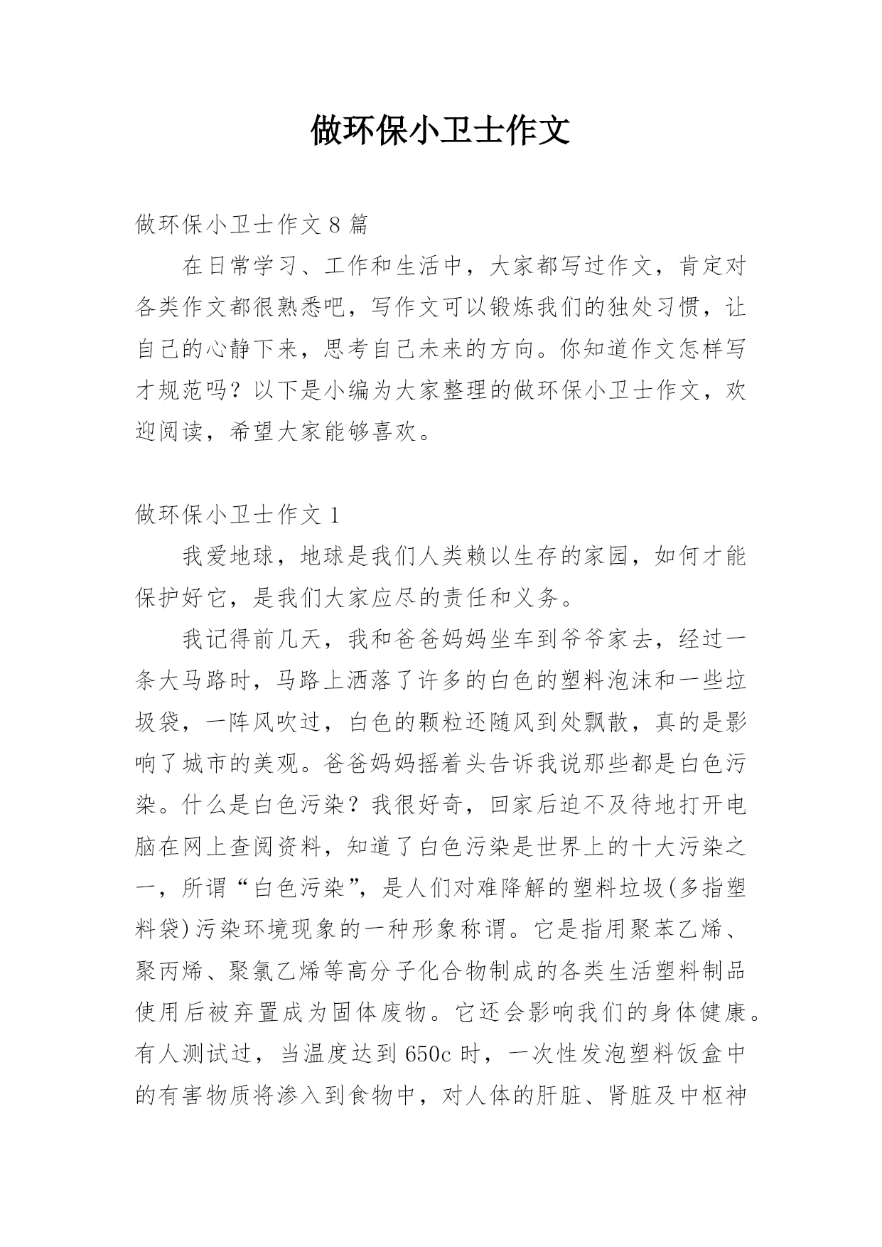 做环保小卫士作文做环保小卫士作文8篇在日常学习、工作和生活中,大家都写过作文,肯定对各类作文都很熟悉吧,写作文可以锻炼我们的独处习惯,让自己的心静下来,思考自己未来的方向。你知道作文怎样写才规范吗?以下是小编为大家整理的做环保小卫士作文,欢迎阅读,希望大家能够喜欢。做环保小卫士作文1我爱地球,地球是我们人类赖以生存的家园,如何才能保护好它,是我们大家应尽的责任和义务。我记得前几天,我和爸爸妈妈坐车到爷爷家去,经过一条大马路时,马路上洒落了许多的白色的塑料泡沫和一些垃圾袋,一阵风吹过,白色的颗粒还随风到处飘