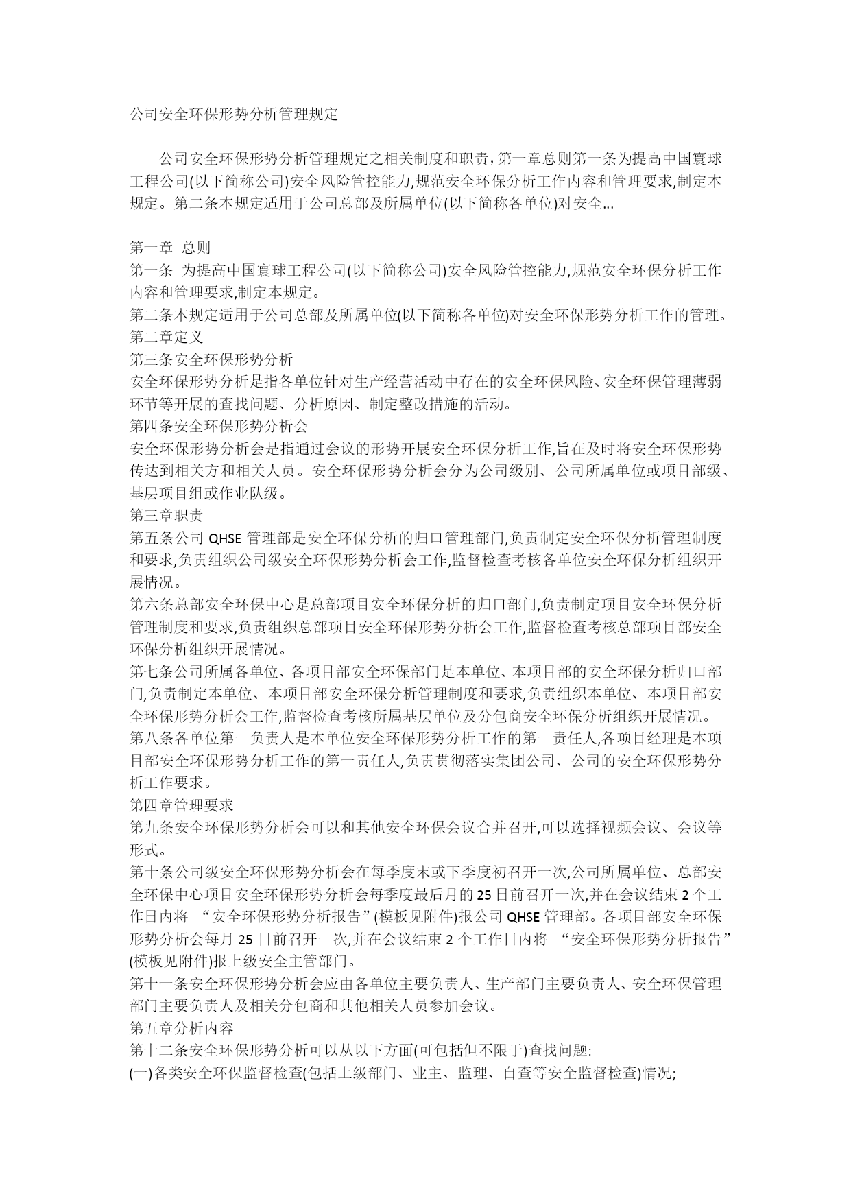 公司安全环保形势分析管理规定公司安全环保形势分析管理规定之相关制度和职责,第一章总则第一条为提高中国寰球工程公司(以下简称公司)安全风险管控能力,规范安全环保分析工作内容和管理要求,制定本规定。第二条本规定适用于公司总部及所属单位(以下简称各单位)对安全...第一章总则第一条为提高中国寰球工程公司(以下简称公司)安全风险管控能力,规范安全环保分析工作内容和管理要求,制定本规定。第二条本规定适用于公司总部及所属单位(以下简称各单位)对安全环保形势分析工作的管理。第二章定义第三条安全环保形势分析安全环保形势分