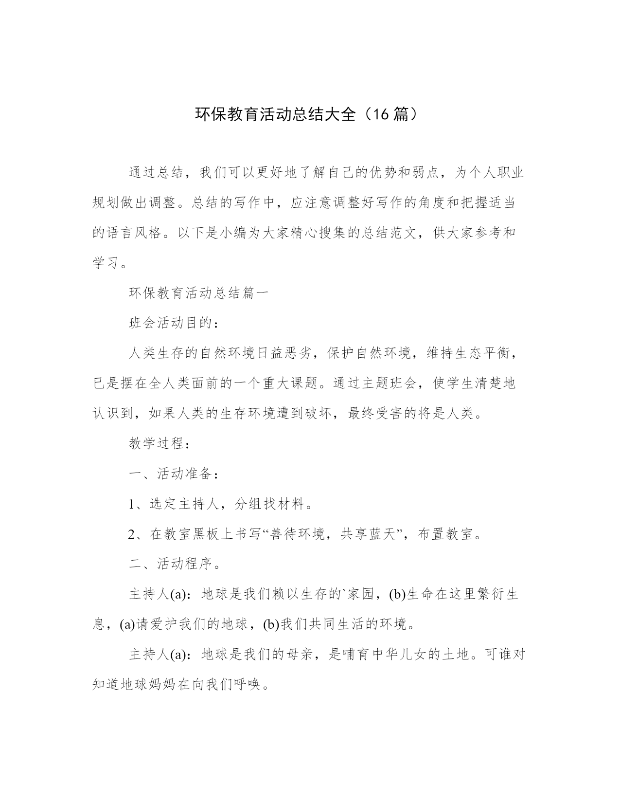 环保教育活动总结大全(16篇)通过总结,我们可以更好地了解自己的优势和弱点,为个人职业规划做出调整。总结的写作中,应注意调整好写作的角度和把握适当的语言风格。以下是小编为大家精心搜集的总结范文,供大家参考和学习。环保教育活动总结篇一班会活动目的:人类生存的自然环境日益恶劣,保护自然环境,维持生态平衡,已是摆在全人类面前的一个重大课题。通过主题班会,使学生清楚地认识到,如果人类的生存环境遭到破坏,最终受害的将是人类。教学过程:一、活动准备:1、选定主持人,分组找材料。2、在教室黑板上书写“善待环境,共享蓝天