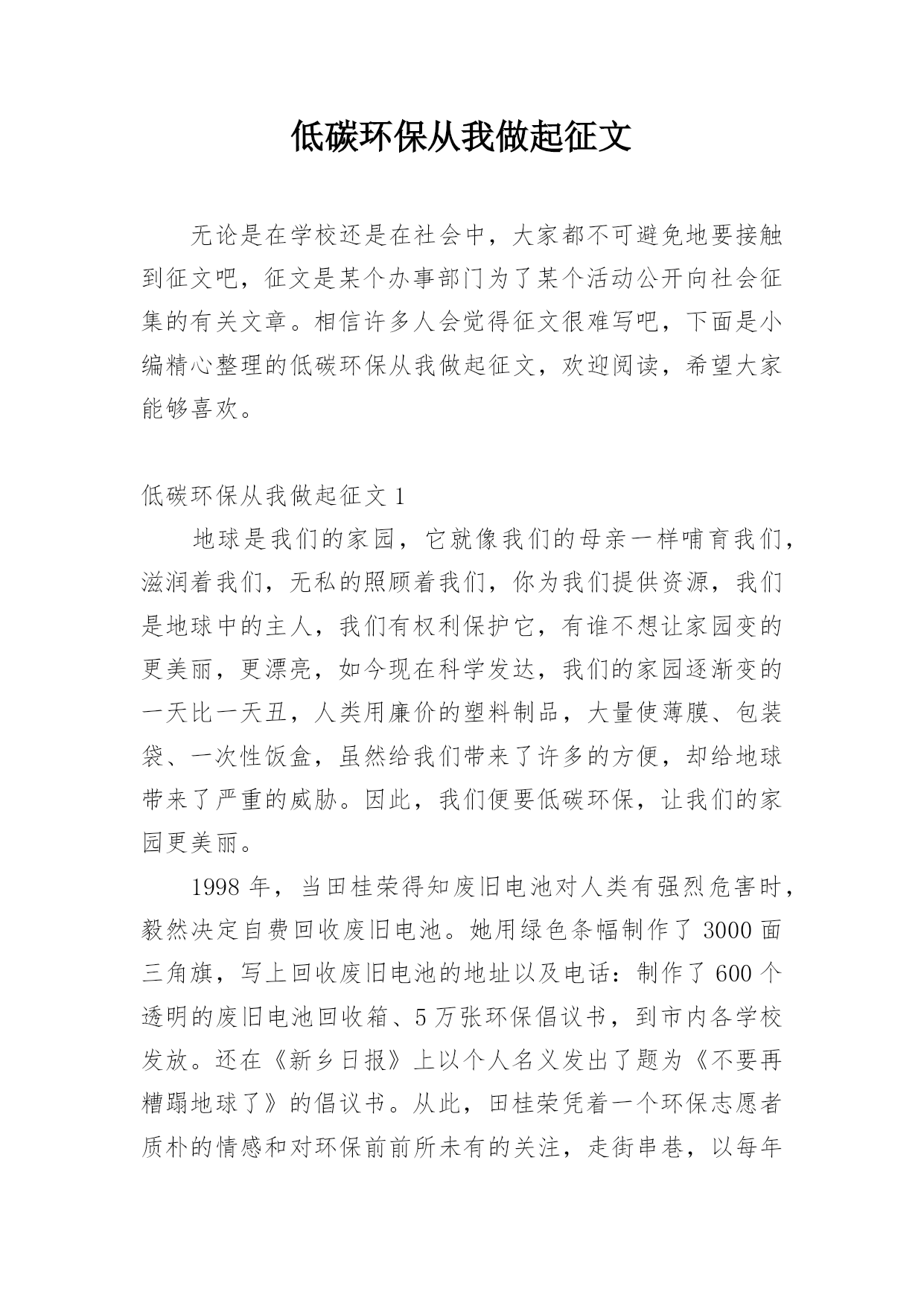 低碳环保从我做起征文无论是在学校还是在社会中,大家都不可避免地要接触到征文吧,征文是某个办事部门为了某个活动公开向社会征集的有关文章。相信许多人会觉得征文很难写吧,下面是小编精心整理的低碳环保从我做起征文,欢迎阅读,希望大家能够喜欢。低碳环保从我做起征文1地球是我们的家园,它就像我们的母亲一样哺育我们,滋润着我们,无私的照顾着我们,你为我们提供资源,我们是地球中的主人,我们有权利保护它,有谁不想让家园变的更美丽,更漂亮,如今现在科学发达,我们的家园逐渐变的一天比一天丑,人类用廉价的塑料制品,大量使薄膜、包