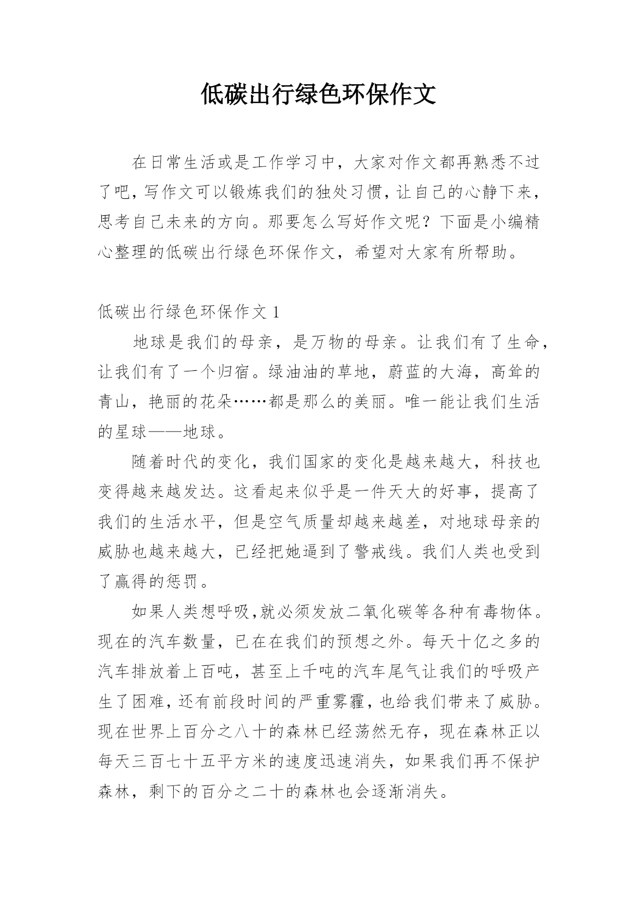 低碳出行绿色环保作文在日常生活或是工作学习中,大家对作文都再熟悉不过了吧,写作文可以锻炼我们的独处习惯,让自己的心静下来,思考自己未来的方向。那要怎么写好作文呢?下面是小编精心整理的低碳出行绿色环保作文,希望对大家有所帮助。低碳出行绿色环保作文1地球是我们的母亲,是万物的母亲。让我们有了生命,让我们有了一个归宿。绿油油的草地,蔚蓝的大海,高耸的青山,艳丽的花朵……都是那么的美丽。唯一能让我们生活的星球——地球。随着时代的变化,我们国家的变化是越来越大,科技也变得越来越发达。这看起来似乎是一件天大的好事,提