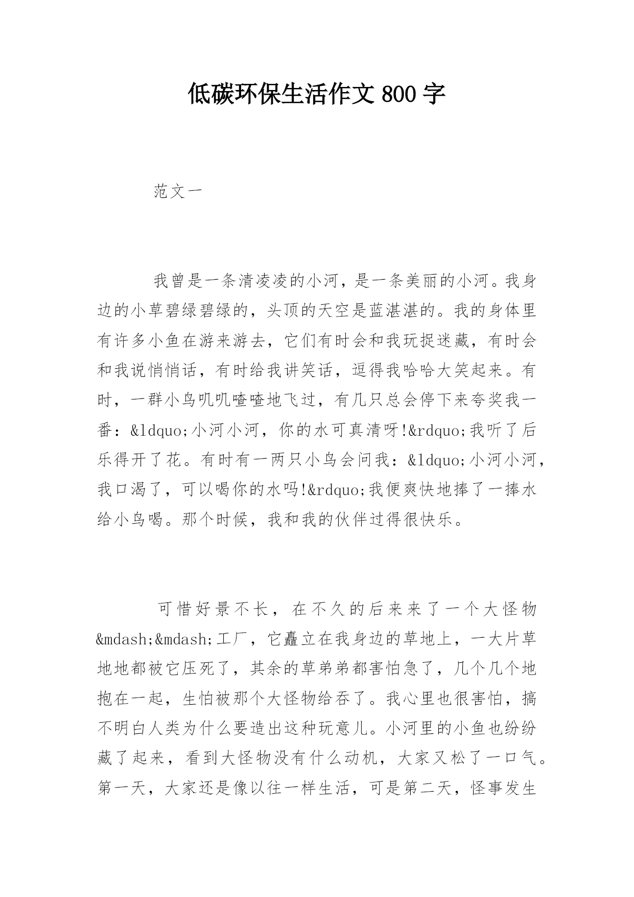 低碳环保生活作文800字范文一我曾是一条清凌凌的小河,是一条美丽的小河。我身边的小草碧绿碧绿的,头顶的天空是蓝湛湛的。我的身体里有许多小鱼在游来游去,它们有时会和我玩捉迷藏,有时会和我说悄悄话,有时给我讲笑话,逗得我哈哈大笑起来。有时,一群小鸟叽叽喳喳地飞过,有几只总会停下来夸奖我一番:“小河小河,你的水可真清呀!”我听了后乐得开了花。有时有一两只小鸟会问我:“小河小河,我口渴了,可以喝你的水吗!”我便爽快地捧了一捧水给小鸟喝。那个时候,我和我的伙伴过得很快