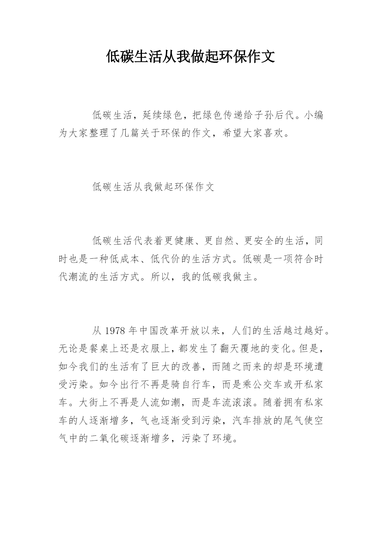 低碳生活绿色环保作文低碳生活绿色环保作文(精选2篇)在我们平凡的日常里,大家都不可避免地要接触到作文吧,借助作文人们可以反映客观事物、表达思想感情、传递知识信息。那要怎么写好作文呢?下面是小编帮大家整理的低碳生活绿色环保作文,仅供参考,大家一起来看看吧。低碳生活绿色环保作文1如今科技在发展,时代在进步,人类的生活标准也越来越高了,私家车几乎每家都有一辆。可是你们想过没有轿车虽然使我们的生活变得方便多了,但是地球却在我们无意中渐渐被破坏了。现在政府正在大力推广低碳活动,可是具体低碳是什么呢?怎样才能做到低碳