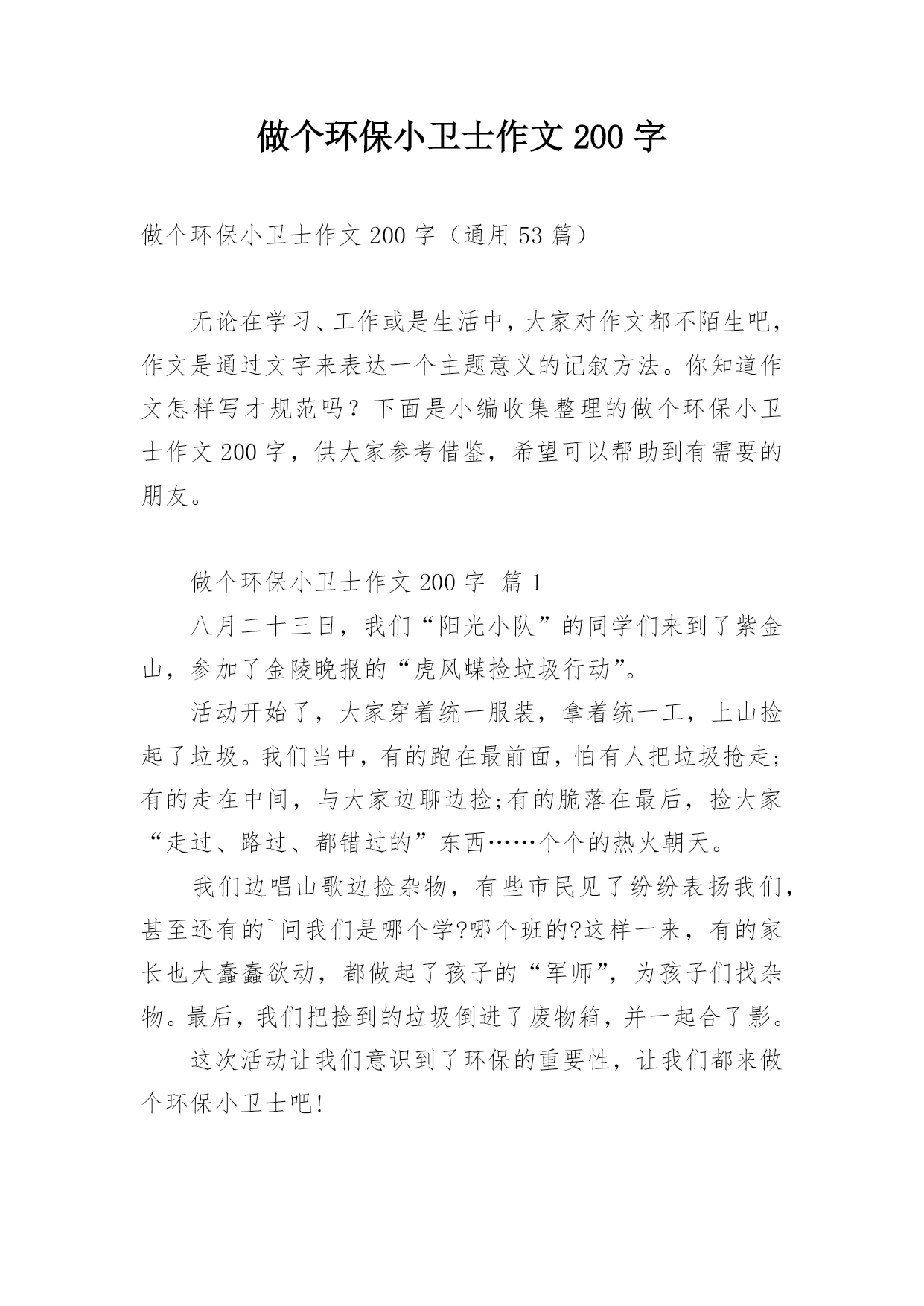做个环保小卫士作文200字做个环保小卫士作文200字(通用53篇)无论在学习、工作或是生活中,大家对作文都不陌生吧,作文是通过文字来表达一个主题意义的记叙方法。你知道作文怎样写才规范吗?下面是小编收集整理的做个环保小卫士作文200字,供大家参考借鉴,希望可以帮助到有需要的朋友。做个环保小卫士作文200字篇1八月二十三日,我们“阳光小队”的同学们来到了紫金山,参加了金陵晚报的“虎风蝶捡垃圾行动”。活动开始了,大家穿着统一服装,拿着统一工,上山捡起了垃圾。我们当中,有的跑在最前面,怕有人把垃圾抢走;有的走在中
