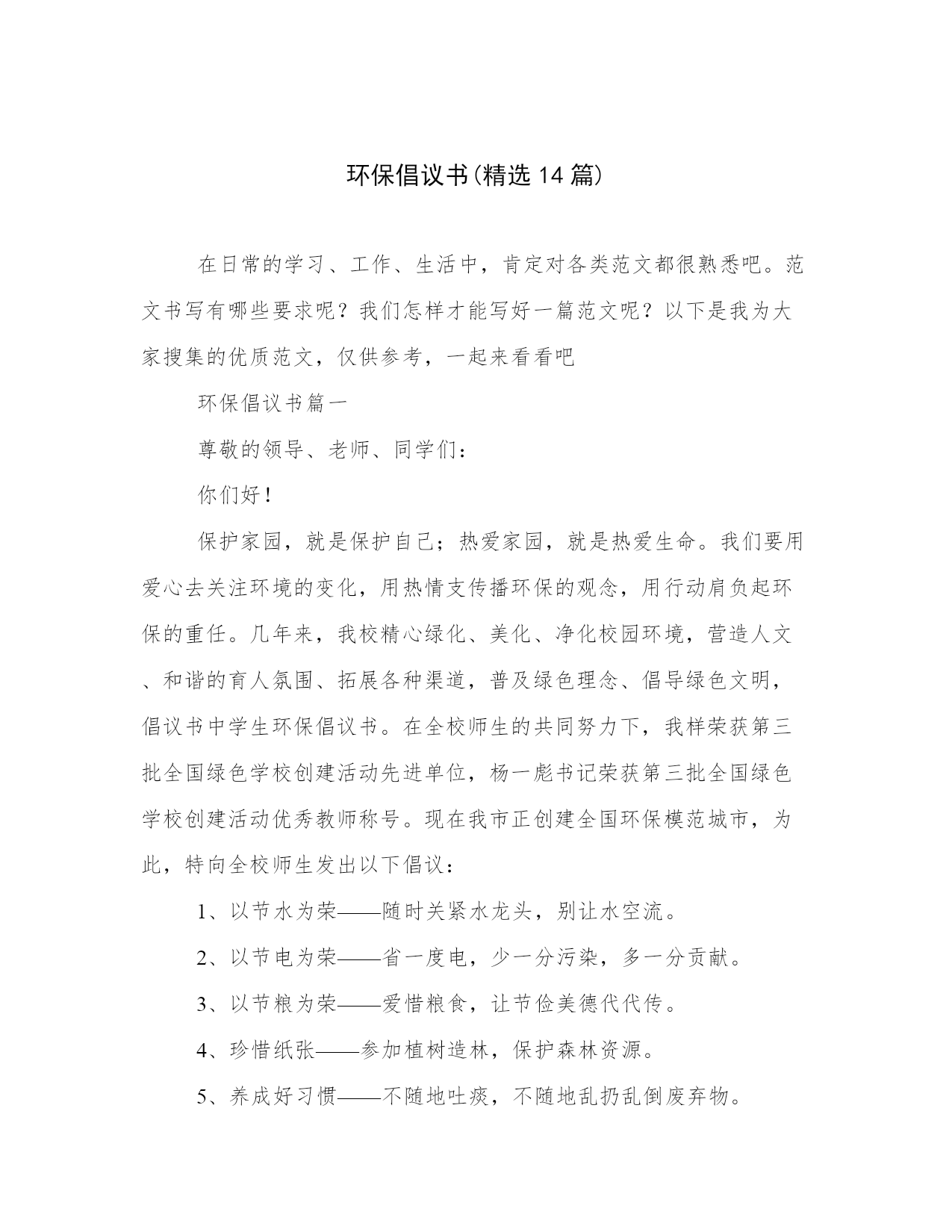 环保倡议书(精选14篇)在日常的学习、工作、生活中,肯定对各类范文都很熟悉吧。范文书写有哪些要求呢?我们怎样才能写好一篇范文呢?以下是我为大家搜集的优质范文,仅供参考,一起来看看吧环保倡议书篇一尊敬的领导、老师、同学们:你们好!保护家园,就是保护自己;热爱家园,就是热爱生命。我们要用爱心去关注环境的变化,用热情支传播环保的观念,用行动肩负起环保的重任。几年来,我校精心绿化、美化、净化校园环境,营造人文、和谐的育人氛围、拓展各种渠道,普及绿色理念、倡导绿色文明,倡议书中学生环保倡议书。在全校师生的共同努力下