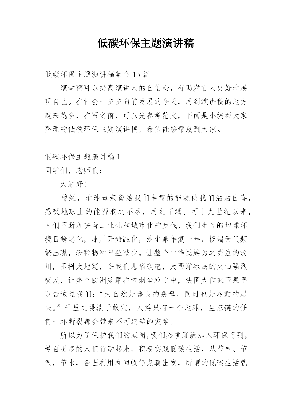 低碳环保主题演讲稿低碳环保主题演讲稿集合15篇演讲稿可以提高演讲人的自信心,有助发言人更好地展现自己。在社会一步步向前发展的今天,用到演讲稿的地方越来越多,在写之前,可以先参考范文,下面是小编帮大家整理的低碳环保主题演讲稿,希望能够帮助到大家。低碳环保主题演讲稿1同学们,老师们:大家好!曾经,地球母亲留给我们丰富的能源使我们沾沾自喜,感叹地球上的能源取之不尽,用之不竭。可十九世纪以来,人们不断加快着工业化和城市化的步伐,我们生存的地球环境日趋恶化,冰川开始融化,沙尘暴年复一年,极端天气频繁出现,珍稀物种日