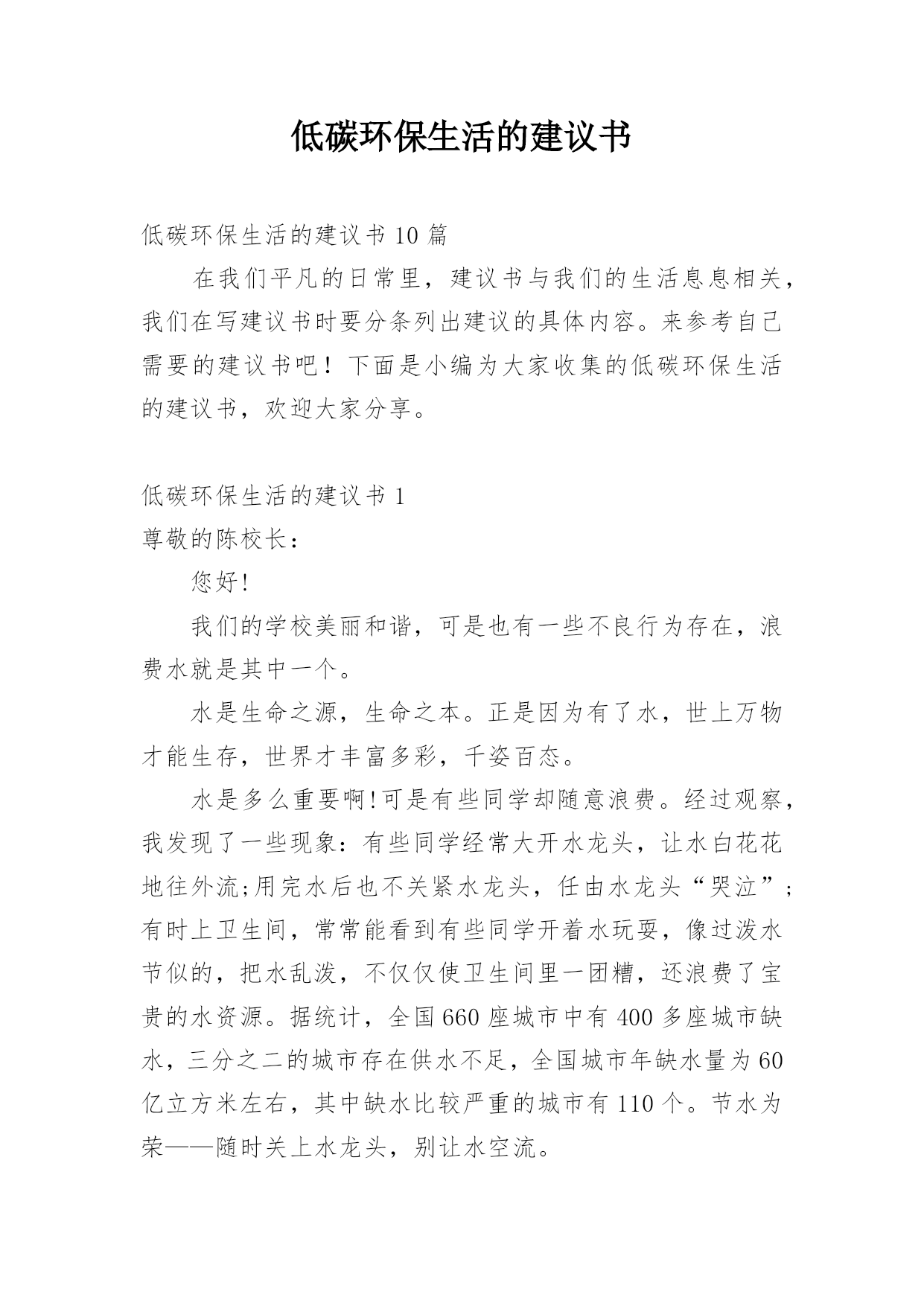 低碳环保生活的建议书低碳环保生活的建议书10篇在我们平凡的日常里,建议书与我们的生活息息相关,我们在写建议书时要分条列出建议的具体内容。来参考自己需要的建议书吧!下面是小编为大家收集的低碳环保生活的建议书,欢迎大家分享。低碳环保生活的建议书1尊敬的陈校长:您好!我们的学校美丽和谐,可是也有一些不良行为存在,浪费水就是其中一个。水是生命之源,生命之本。正是因为有了水,世上万物才能生存,世界才丰富多彩,千姿百态。水是多么重要啊!可是有些同学却随意浪费。经过观察,我发现了一些现象:有些同学经常大开水龙头,让水白