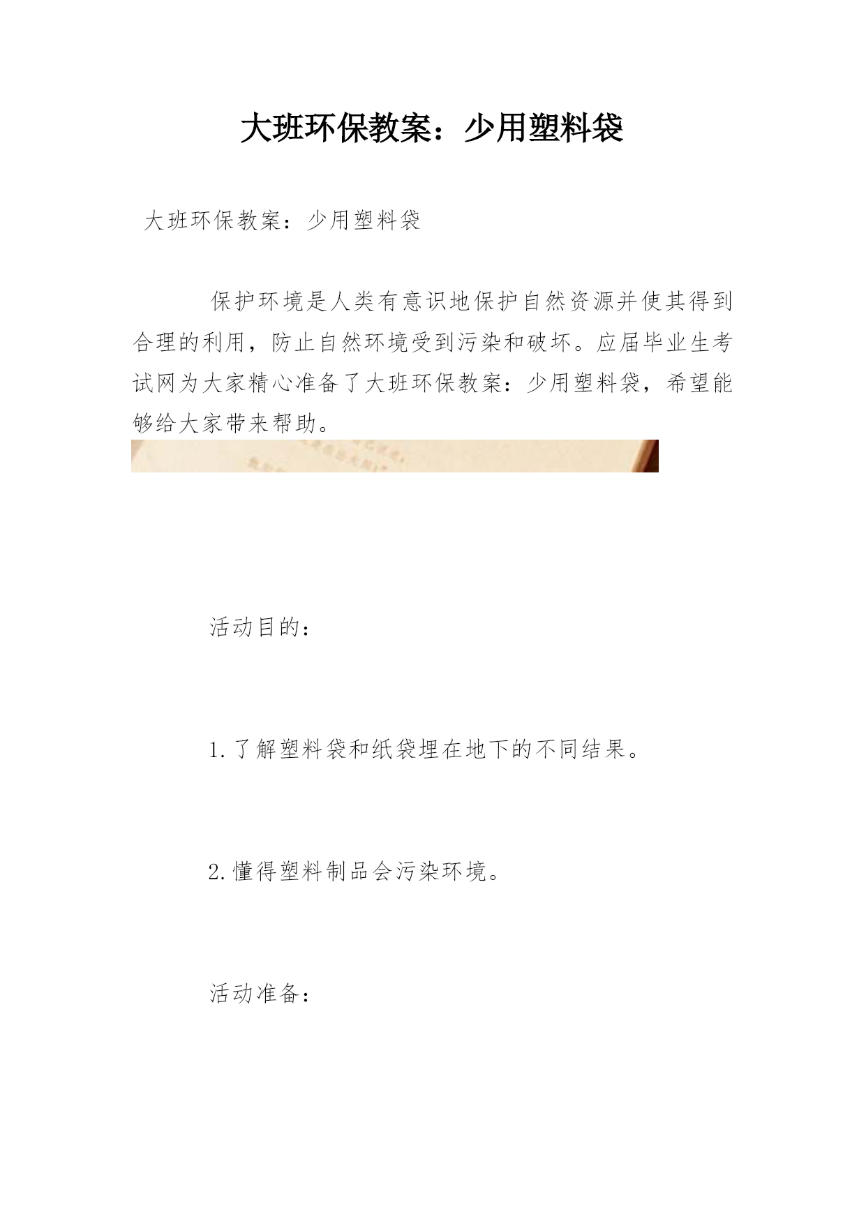 大班环保教案:少用塑料袋大班环保教案:少用塑料袋保护环境是人类有意识地保护自然资源并使其得到合理的利用,防止自然环境受到污染和破坏。应届毕业生考试网为大家精心准备了大班环保教案:少用塑料袋,希望能够给大家带来帮助。活动目的:1.了解塑料袋和纸袋埋在地下的不同结果。2.懂得塑料制品会污染环境。活动准备:一个月前,带领幼儿在园内挖两个坑,分别将一只塑料袋和一只纸袋埋在地下,并做上记号。活动过程:一、现场观看实验结果。1.一个月前,我们一起把塑料袋和纸袋埋在了地下,你们猜它们现在会有什么变化?2.教师带领幼儿根