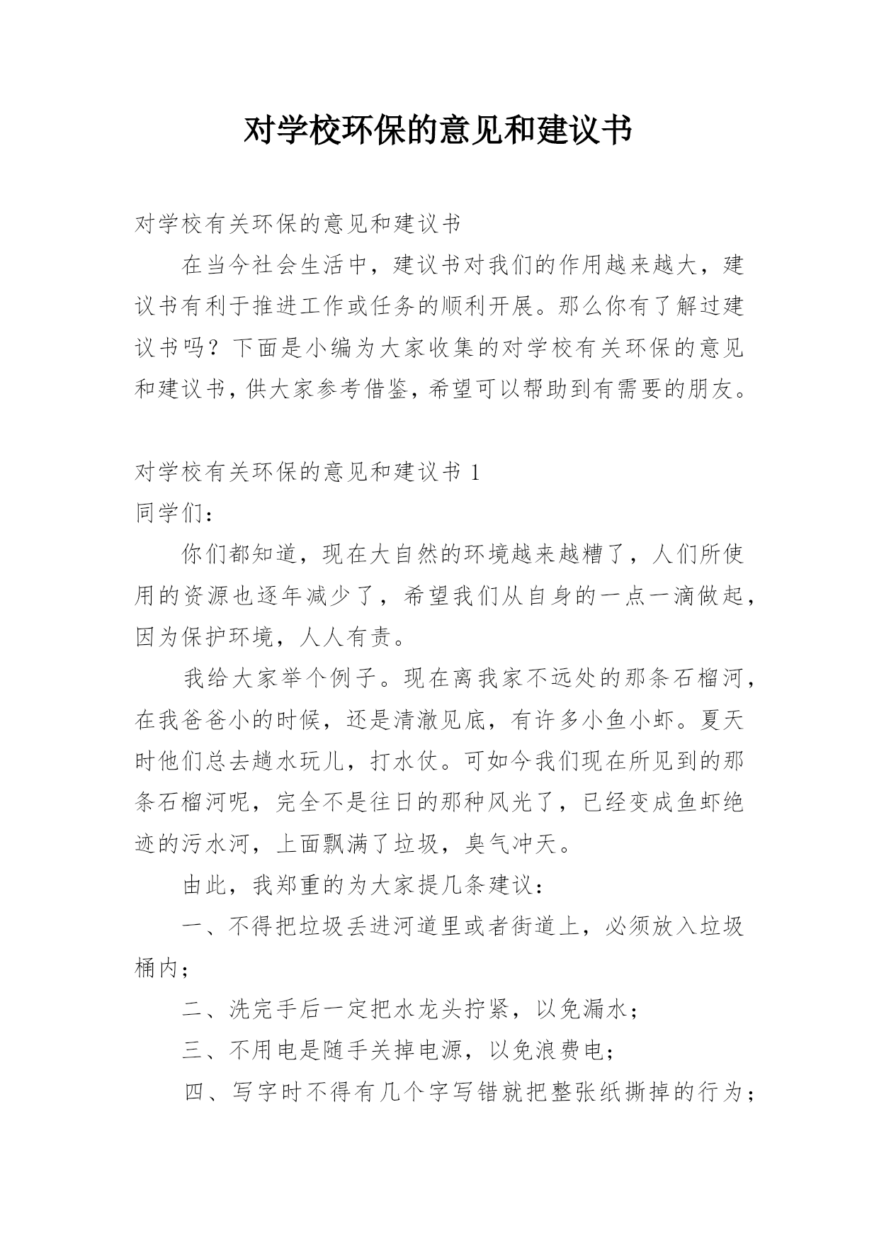 对学校环保的意见和建议书对学校有关环保的意见和建议书在当今社会生活中,建议书对我们的作用越来越大,建议书有利于推进工作或任务的顺利开展。那么你有了解过建议书吗?下面是小编为大家收集的对学校有关环保的意见和建议书,供大家参考借鉴,希望可以帮助到有需要的朋友。对学校有关环保的意见和建议书1同学们:你们都知道,现在大自然的环境越来越糟了,人们所使用的资源也逐年减少了,希望我们从自身的一点一滴做起,因为保护环境,人人有责。我给大家举个例子。现在离我家不远处的那条石榴河,在我爸爸小的时候,还是清澈见底,有许多小鱼小
