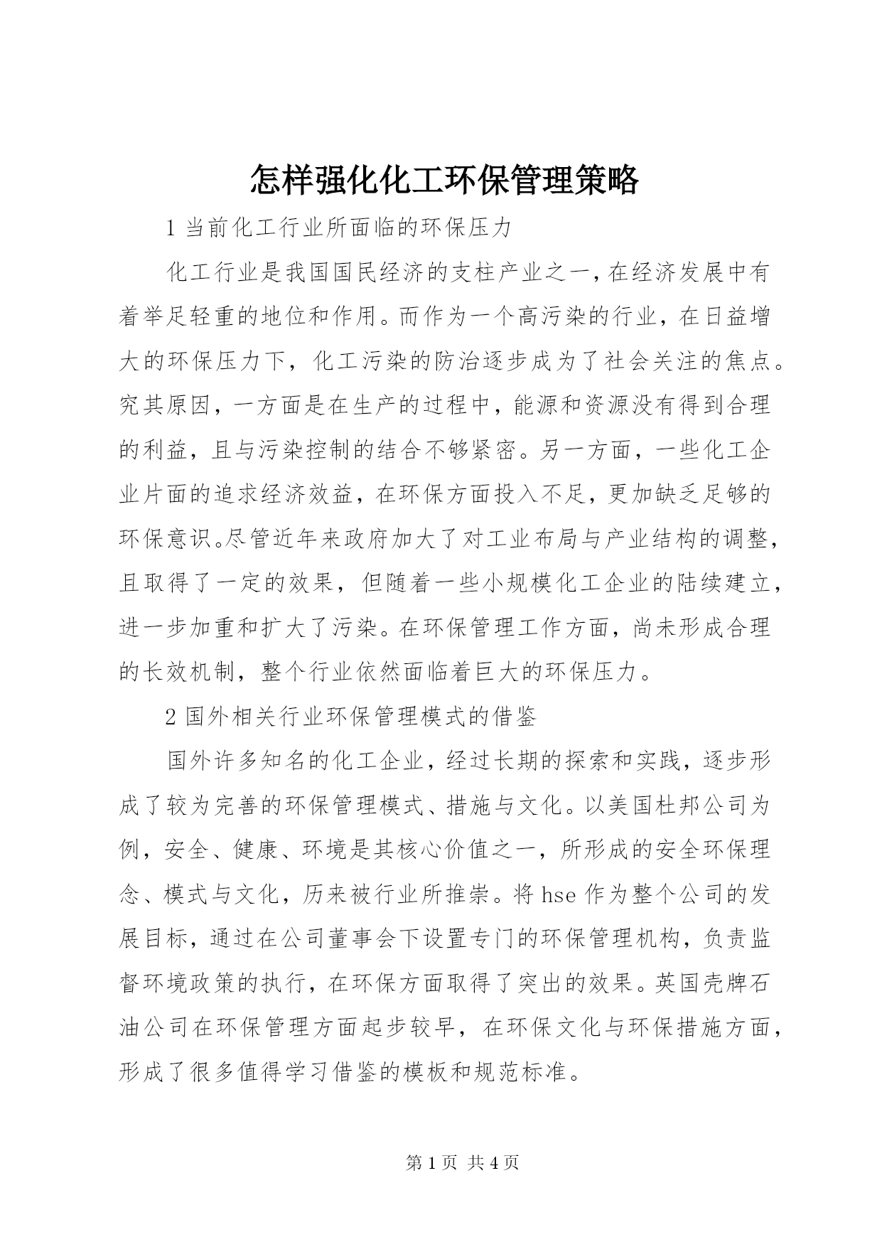第PAGE\*Arabic\*MERGEFORMAT4页共NUMPAGES\*MERGEFORMAT4页怎样强化化工环保管理策略1当前化工行业所面临的环保压力化工行业是我国国民经济的支柱产业之一,在经济发展中有着举足轻重的地位和作用。而作为一个高污染的行业,在日益增大的环保压力下,化工污染的防治逐步成为了社会关注的焦点。究其原因,一方面是在生产的过程中,能源和资源没有得到合理的利益,且与污染控制的结合不够紧密。另一方面,一些化工企业片面的追求经济效益,在环保方面投入不足,更加缺乏足够的环保意识