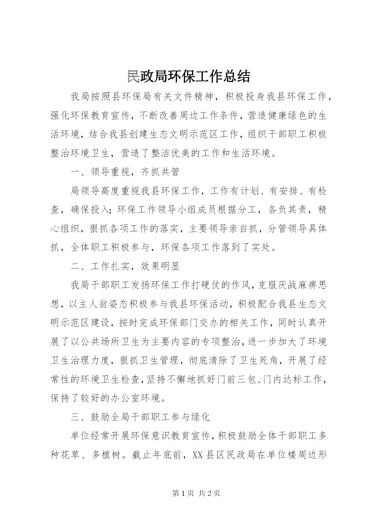 第PAGE\*Arabic\*MERGEFORMAT2页共NUMPAGES\*MERGEFORMAT2页民政局环保工作总结我局按照县环保局有关文件精神,积极投身我县环保工作,强化环保教育宣传,不断改善周边工作条件,营造健康绿色的生活环境,结合我县创建生态文明示范区工作,组织干部职工积极整治环境卫生,营造了整洁优美的工作和生活环境。一、领导重视,齐抓共管局领导高度重视我县环保工作,工作有计划、有安排、有检查,确保投入;环保工作领导小组成员根据分工,各负其责,精心组织,狠抓各项工作的落实,主要领导