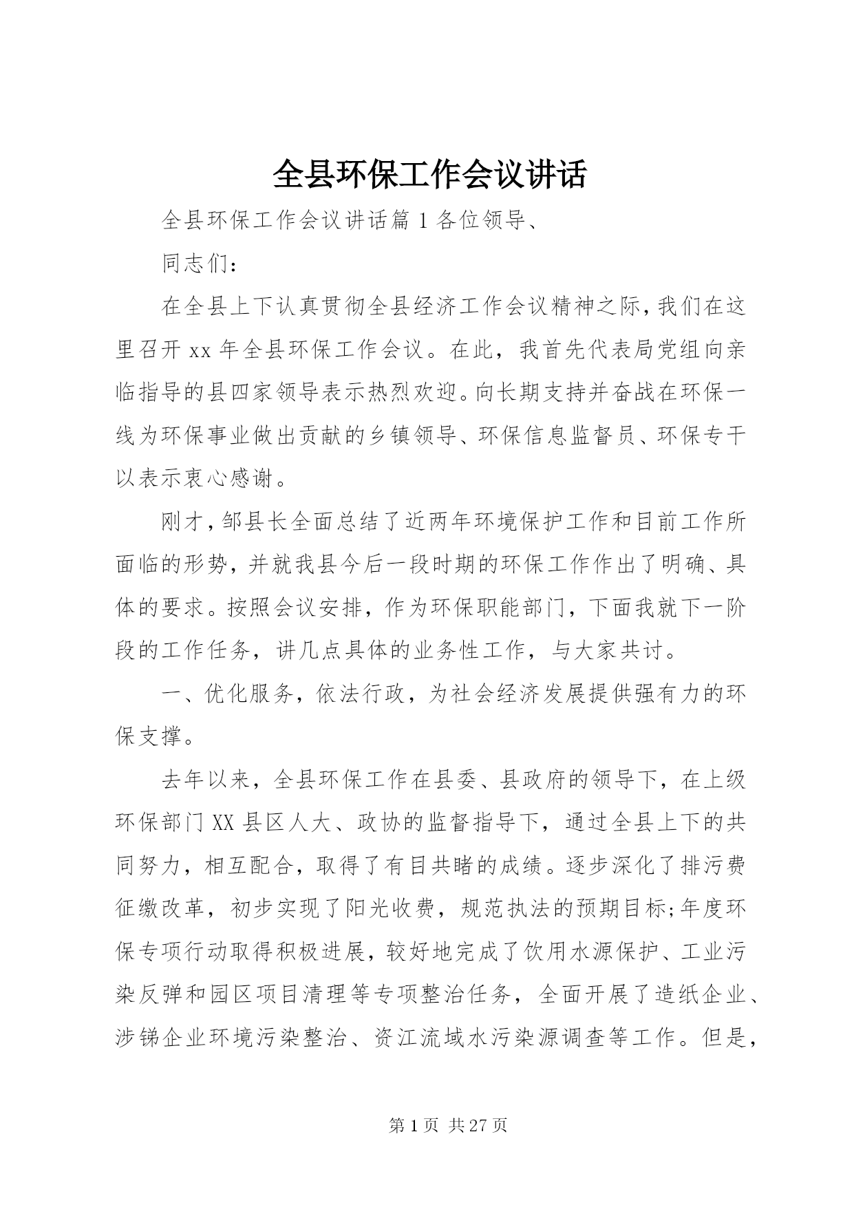 第PAGE\*Arabic\*MERGEFORMAT27页共NUMPAGES\*MERGEFORMAT27页全县环保工作会议讲话全县环保工作会议讲话篇1各位领导、同志们:在全县上下认真贯彻全县经济工作会议精神之际,我们在这里召开xx年全县环保工作会议。在此,我首先代表局党组向亲临指导的县四家领导表示热烈欢迎。向长期支持并奋战在环保一线为环保事业做出贡献的乡镇领导、环保信息监督员、环保专干以表示衷心感谢。刚才,邹县长全面总结了近两年环境保护工作和目前工作所面临的形势,并就我县今后一段时期的环保工