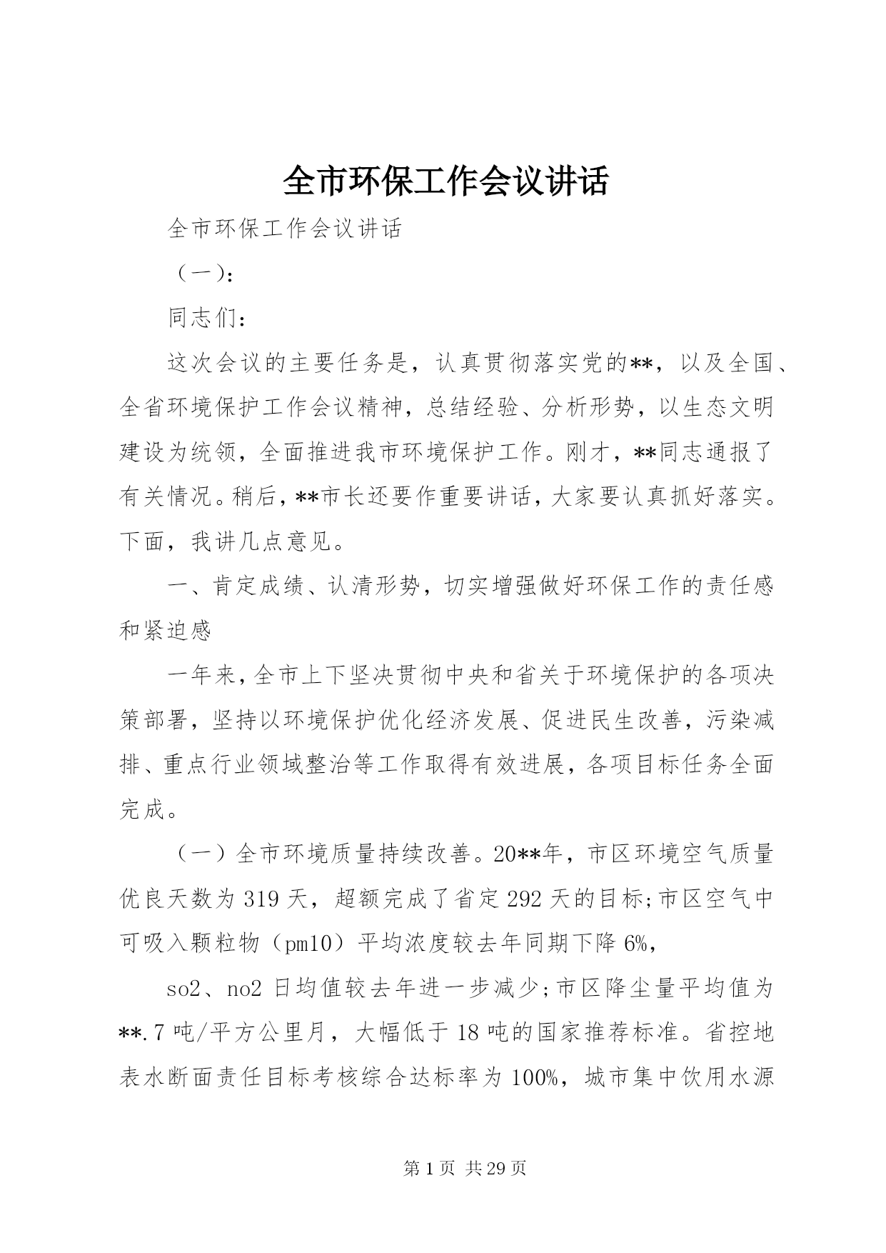 第PAGE\*Arabic\*MERGEFORMAT29页共NUMPAGES\*MERGEFORMAT29页全市环保工作会议讲话全市环保工作会议讲话(一):同志们:这次会议的主要任务是,认真贯彻落实党的**,以及全国、全省环境保护工作会议精神,总结经验、分析形势,以生态文明建设为统领,全面推进我市环境保护工作。刚才,**同志通报了有关情况。稍后,**市长还要作重要讲话,大家要认真抓好落实。下面,我讲几点意见。一、肯定成绩、认清形势,切实增强做好环保工作的责任感和紧迫感一年来,全市上下坚决贯彻中
