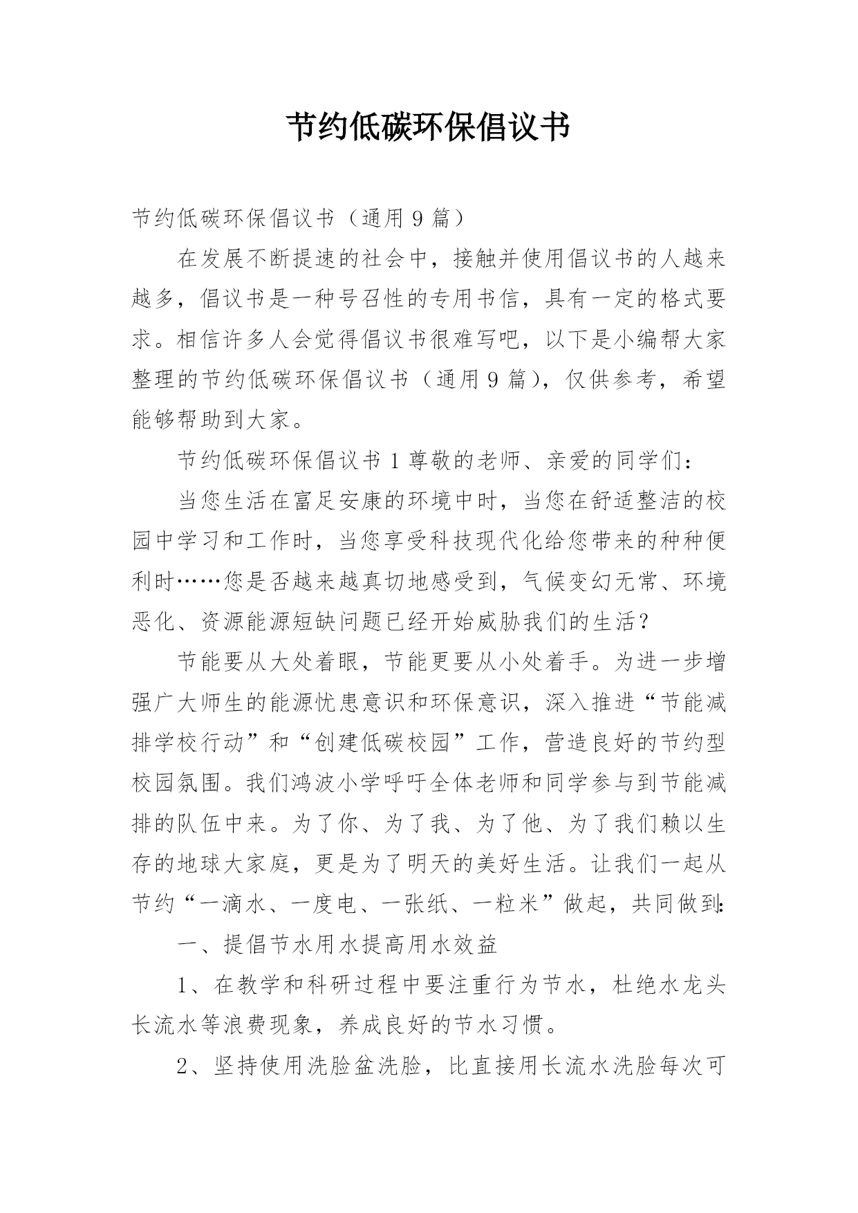 节约低碳环保倡议书节约低碳环保倡议书(通用9篇)在发展不断提速的社会中,接触并使用倡议书的人越来越多,倡议书是一种号召性的专用书信,具有一定的格式要求。相信许多人会觉得倡议书很难写吧,以下是小编帮大家整理的节约低碳环保倡议书(通用9篇),仅供参考,希望能够帮助到大家。节约低碳环保倡议书1尊敬的老师、亲爱的同学们:当您生活在富足安康的环境中时,当您在舒适整洁的校园中学习和工作时,当您享受科技现代化给您带来的种种便利时……您是否越来越真切地感受到,气候变幻无常、环境恶化、资源能源短缺问题已经开始威胁我们的生活