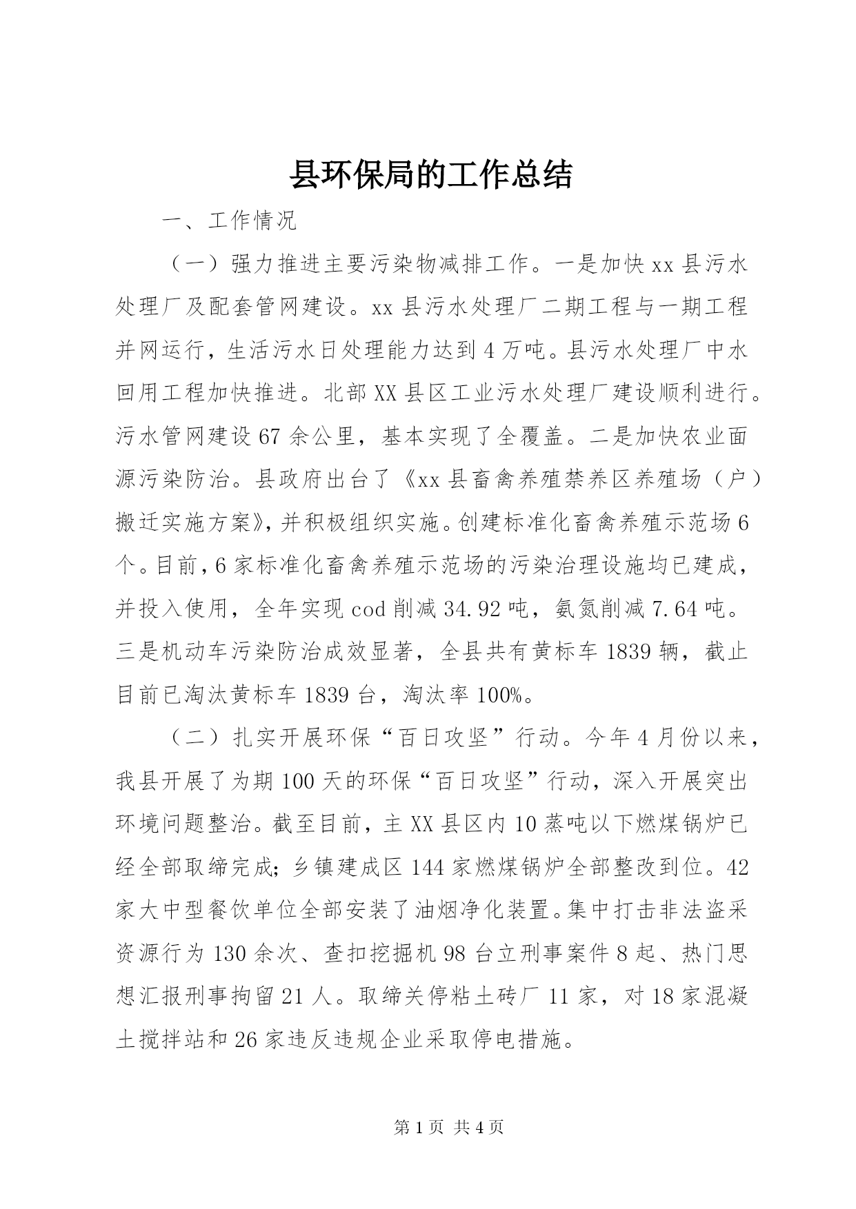 第PAGE\*Arabic\*MERGEFORMAT4页共NUMPAGES\*MERGEFORMAT4页县环保局的工作总结一、工作情况(一)强力推进主要污染物减排工作。一是加快xx县污水处理厂及配套管网建设。xx县污水处理厂二期工程与一期工程并网运行,生活污水日处理能力达到4万吨。县污水处理厂中水回用工程加快推进。北部XX县区工业污水处理厂建设顺利进行。污水管网建设67余公里,基本实现了全覆盖。二是加快农业面源污染防治。县政府出台了《xx县畜禽养殖禁养区养殖场(户)搬迁实施方案》,并积极组织实