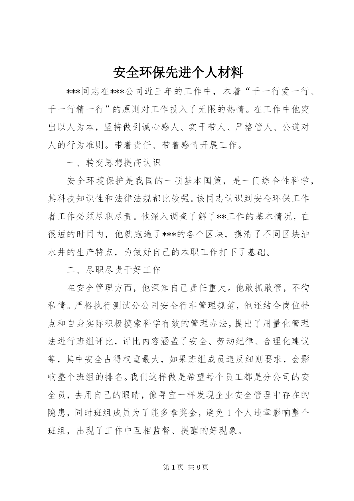 第PAGE\*Arabic\*MERGEFORMAT8页共NUMPAGES\*MERGEFORMAT8页安全环保先进个人材料***同志在***公司近三年的工作中,本着“干一行爱一行、干一行精一行”的原则对工作投入了无限的热情。在工作中他突出以人为本,坚持做到诚心感人、实干带人、严格管人、公道对人的行为准则。带着责任、带着感情开展工作。一、转变思想提高认识安全环境保护是我国的一项基本国策,是一门综合性科学,其科技知识性和法律法规都比较强。该同志认识到安全环保工作者工作必须尽职尽责。他深入调查了解