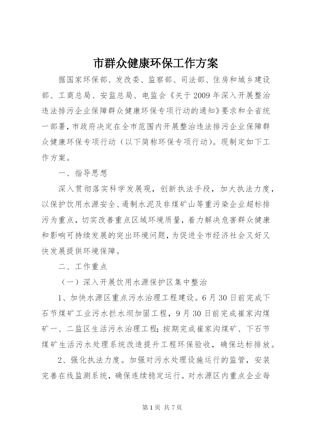 第PAGE\*Arabic\*MERGEFORMAT7页共NUMPAGES\*MERGEFORMAT7页市群众健康环保工作方案据国家环保部、发改委、监察部、司法部、住房和城乡建设部、工商总局、安监总局、电监会《关于2009年深入开展整治违法排污企业保障群众健康环保专项行动的通知》要求和全省统一部署,市政府决定在全市范围内开展整治违法排污企业保障群众健康环保专项行动(以下简称环保专项行动)。现制定如下工作方案。一、指导思想深入贯彻落实科学发展观,创新执法手段,加大执法力度,以保护饮用水源安全、遏