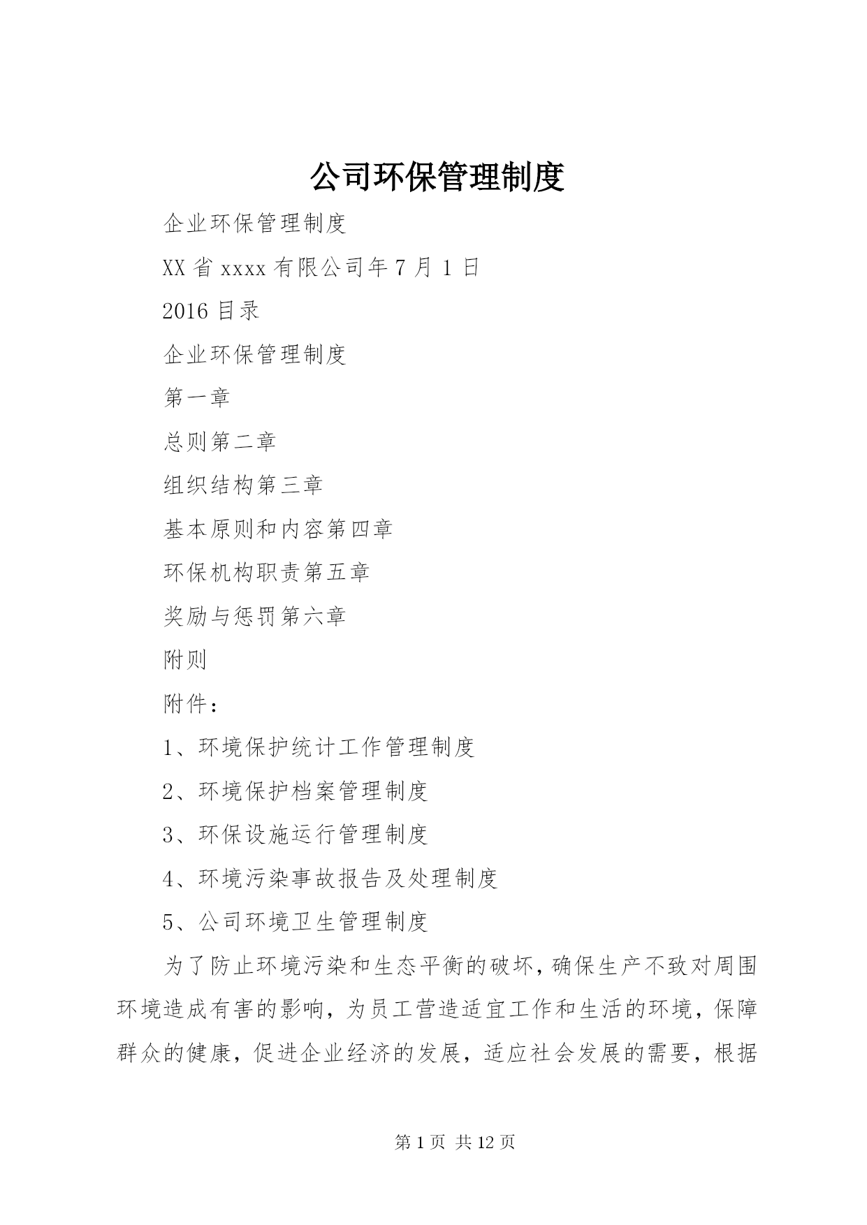 第PAGE\*Arabic\*MERGEFORMAT12页共NUMPAGES\*MERGEFORMAT12页公司环保管理制度企业环保管理制度XX省xxxx有限公司年7月1日2016目录企业环保管理制度第一章总则第二章组织结构第三章基本原则和内容第四章环保机构职责第五章奖励与惩罚第六章附则附件:1、环境保护统计工作管理制度2、环境保护档案管理制度3、环保设施运行管理制度4、环境污染事故报告及处理制度5、公司环境卫生管理制度为了防止环境污染和生态平衡的破坏,确保生产不致对周围环境造成有害的影响,为