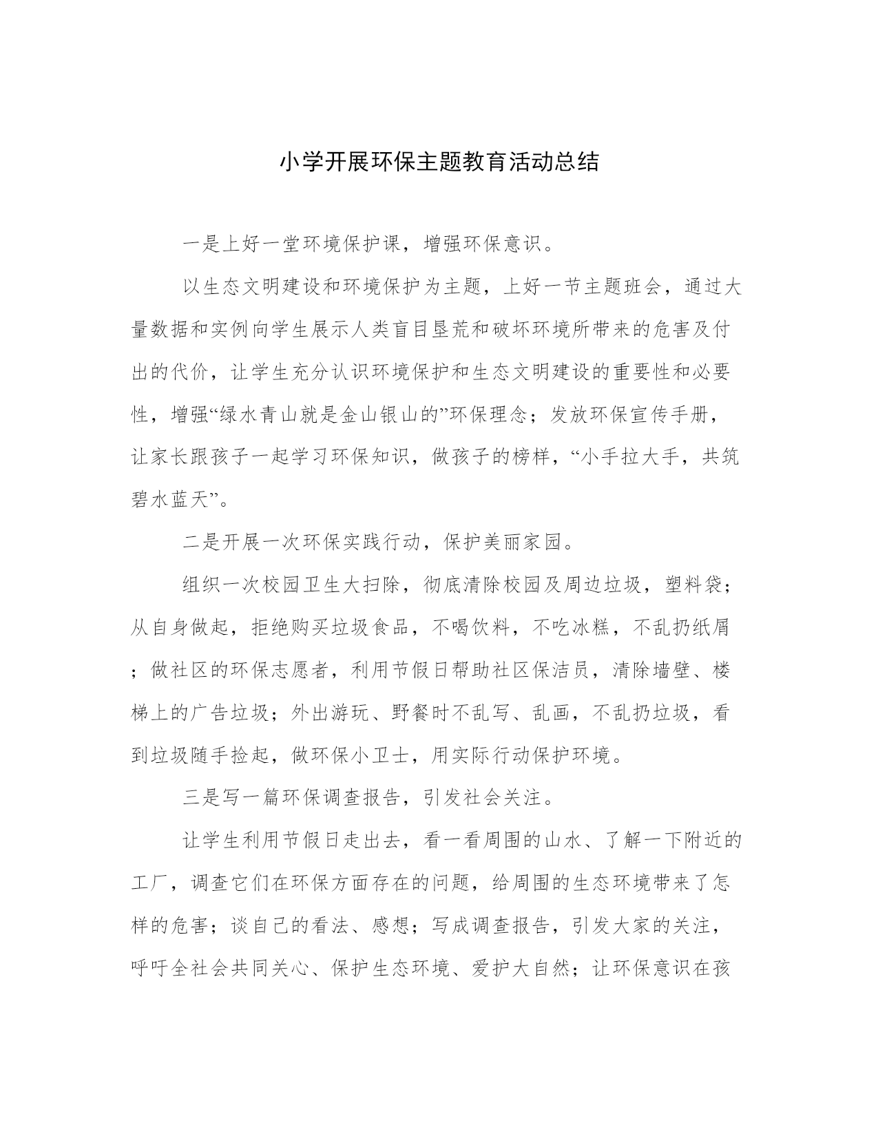 小学开展环保主题教育活动总结一是上好一堂环境保护课,增强环保意识。以生态文明建设和环境保护为主题,上好一节主题班会,通过大量数据和实例向学生展示人类盲目垦荒和破坏环境所带来的危害及付出的代价,让学生充分认识环境保护和生态文明建设的重要性和必要性,增强“绿水青山就是金山银山的”环保理念;发放环保宣传手册,让家长跟孩子一起学习环保知识,做孩子的榜样,“小手拉大手,共筑碧水蓝天”。二是开展一次环保实践行动,保护美丽家园。组织一次校园卫生大扫除,彻底清除校园及周边垃圾,塑料袋;从自身做起,拒绝购买垃圾食品,不喝饮