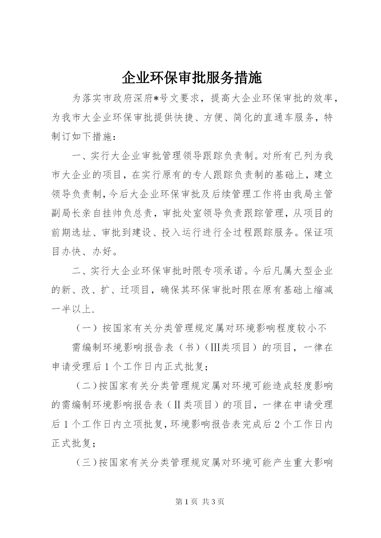 第PAGE\*Arabic\*MERGEFORMAT3页共NUMPAGES\*MERGEFORMAT3页企业环保审批服务措施为落实市政府深府*号文要求,提高大企业环保审批的效率,为我市大企业环保审批提供快捷、方便、简化的直通车服务,特制订如下措施:一、实行大企业审批管理领导跟踪负责制。对所有已列为我市大企业的项目,在实行原有的专人跟踪负责制的基础上,建立领导负责制,今后大企业环保审批及后续管理工作将由我局主管副局长亲自挂帅负总责,审批处室领导负责跟踪管理,从项目的前期选址、审批到建设、投入运行