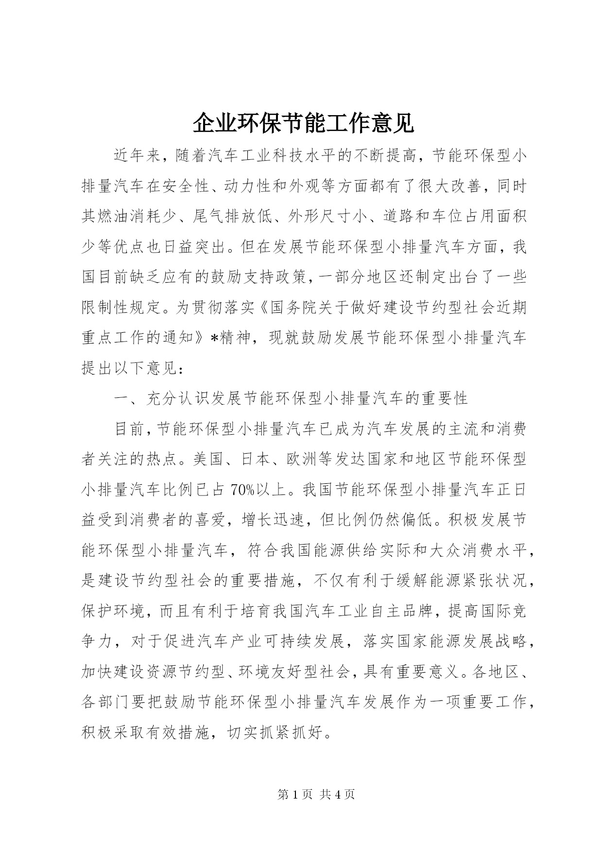 第PAGE\*Arabic\*MERGEFORMAT4页共NUMPAGES\*MERGEFORMAT4页企业环保节能工作意见近年来,随着汽车工业科技水平的不断提高,节能环保型小排量汽车在安全性、动力性和外观等方面都有了很大改善,同时其燃油消耗少、尾气排放低、外形尺寸小、道路和车位占用面积少等优点也日益突出。但在发展节能环保型小排量汽车方面,我国目前缺乏应有的鼓励支持政策,一部分地区还制定出台了一些限制性规定。为贯彻落实《国务院关于做好建设节约型社会近期重点工作的通知》*精神,现就鼓励发展节能环