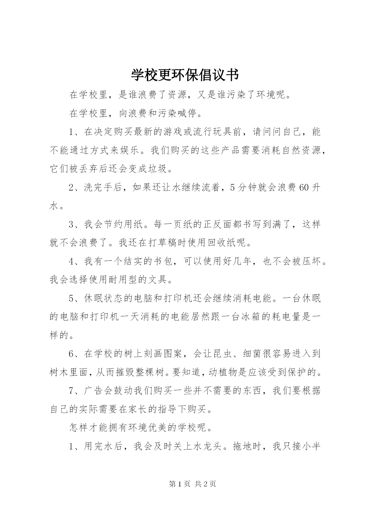 第PAGE\*Arabic\*MERGEFORMAT2页共NUMPAGES\*MERGEFORMAT2页学校更环保倡议书在学校里,是谁浪费了资源,又是谁污染了环境呢。在学校里,向浪费和污染喊停。1、在决定购买最新的游戏或流行玩具前,请问问自己,能不能通过方式来娱乐。我们购买的这些产品需要消耗自然资源,它们被丢弃后还会变成垃圾。2、洗完手后,如果还让水继续流着,5分钟就会浪费60升水。3、我会节约用纸。每一页纸的正反面都书写到满了,这样就不会浪费了。我还在打草稿时使用回收纸呢。4、我有一个结实的
