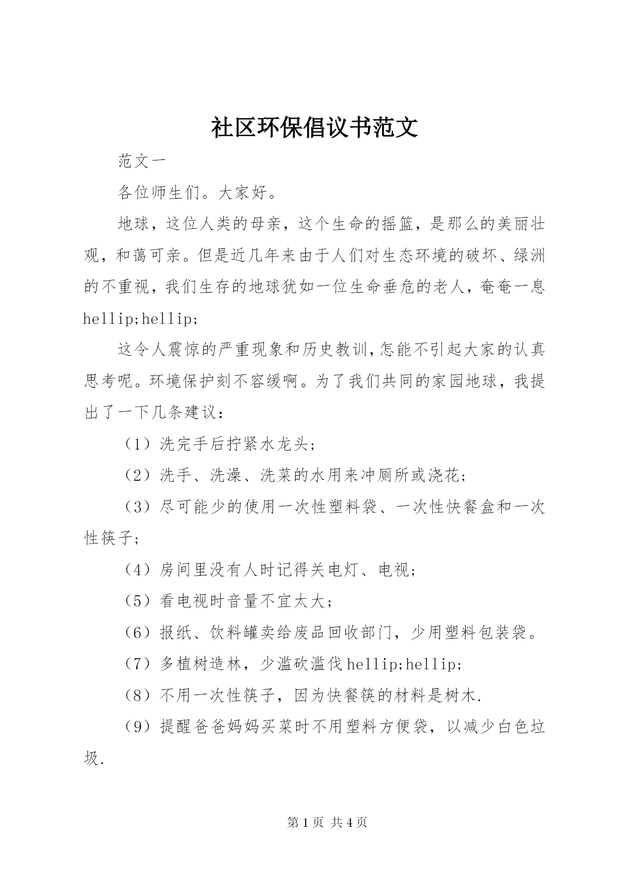 第PAGE\*Arabic\*MERGEFORMAT4页共NUMPAGES\*MERGEFORMAT4页社区环保倡议书范文范文一各位师生们。大家好。地球,这位人类的母亲,这个生命的摇篮,是那么的美丽壮观,和蔼可亲。但是近几年来由于人们对生态环境的破坏、绿洲的不重视,我们生存的地球犹如一位生命垂危的老人,奄奄一息hellip;hellip;这令人震惊的严重现象和历史教训,怎能不引起大家的认真思考呢。环境保护刻不容缓啊。为了我们共同的家园地球,我提出了一下几条建议:(1)洗完手后拧紧水龙头;(2)
