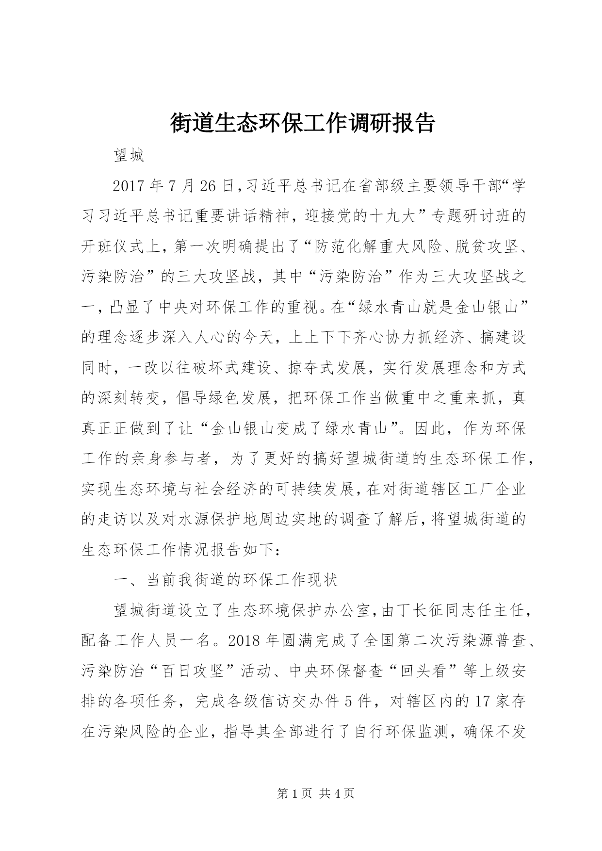 第PAGE\*Arabic\*MERGEFORMAT4页共NUMPAGES\*MERGEFORMAT4页街道生态环保工作调研报告望城2017年7月26日,习近平总书记在省部级主要领导干部“学习习近平总书记重要讲话精神,迎接党的十九大”专题研讨班的开班仪式上,第一次明确提出了“防范化解重大风险、脱贫攻坚、污染防治”的三大攻坚战,其中“污染防治”作为三大攻坚战之一,凸显了中央对环保工作的重视。在“绿水青山就是金山银山”的理念逐步深入人心的今天,上上下下齐心协力抓经济、搞建设同时,一改以往破坏式建设