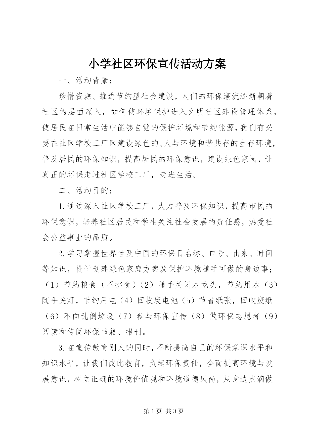 第PAGE\*Arabic\*MERGEFORMAT3页共NUMPAGES\*MERGEFORMAT3页小学社区环保宣传活动方案一、活动背景:珍惜资源、推进节约型社会建设,人们的环保潮流逐渐朝着社区的层面深入,如何使环境保护进入文明社区建设管理体系,使居民在日常生活中能够自觉的保护环境和节约能源,我们有必要在社区学校工厂区建设绿色的、人与环境和谐共存的生存环境,普及居民的环保知识,提高居民的环保意识,建设绿色家园,让真正的环保走进社区学校工厂,走进生活。二、活动目的:1.通过深入社区学校工厂,