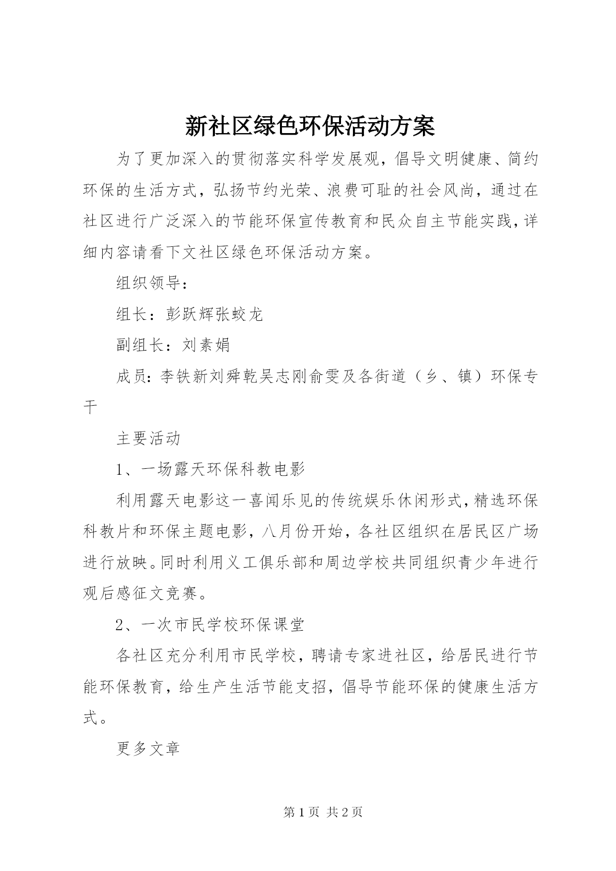第PAGE\*Arabic\*MERGEFORMAT2页共NUMPAGES\*MERGEFORMAT2页新社区绿色环保活动方案为了更加深入的贯彻落实科学发展观,倡导文明健康、简约环保的生活方式,弘扬节约光荣、浪费可耻的社会风尚,通过在社区进行广泛深入的节能环保宣传教育和民众自主节能实践,详细内容请看下文社区绿色环保活动方案。组织领导:组长:彭跃辉张蛟龙副组长:刘素娟成员:李铁新刘舜乾吴志刚俞雯及各街道(乡、镇)环保专干主要活动1、一场露天环保科教电影利用露天电影这一喜闻乐见的传统娱乐休闲形式,