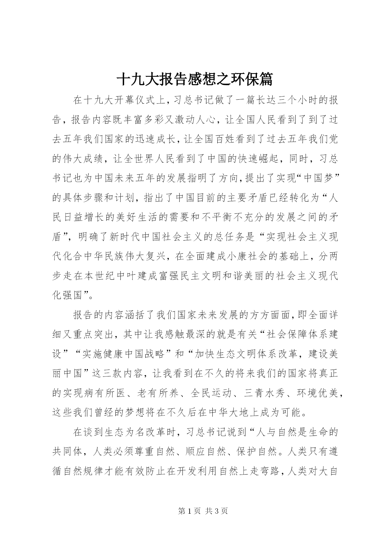 第PAGE\*Arabic\*MERGEFORMAT3页共NUMPAGES\*MERGEFORMAT3页十九大报告感想之环保篇在十九大开幕仪式上,习总书记做了一篇长达三个小时的报告,报告内容既丰富多彩又激动人心,让全国人民看到了到了过去五年我们国家的迅速成长,让全国百姓看到了过去五年我们党的伟大成绩,让全世界人民看到了中国的快速崛起,同时,习总书记也为中国未来五年的发展指明了方向,提出了实现“中国梦”的具体步骤和计划,指出了中国目前的主要矛盾已经转化为“人民日益增长的美好生活的需要和不平衡不充