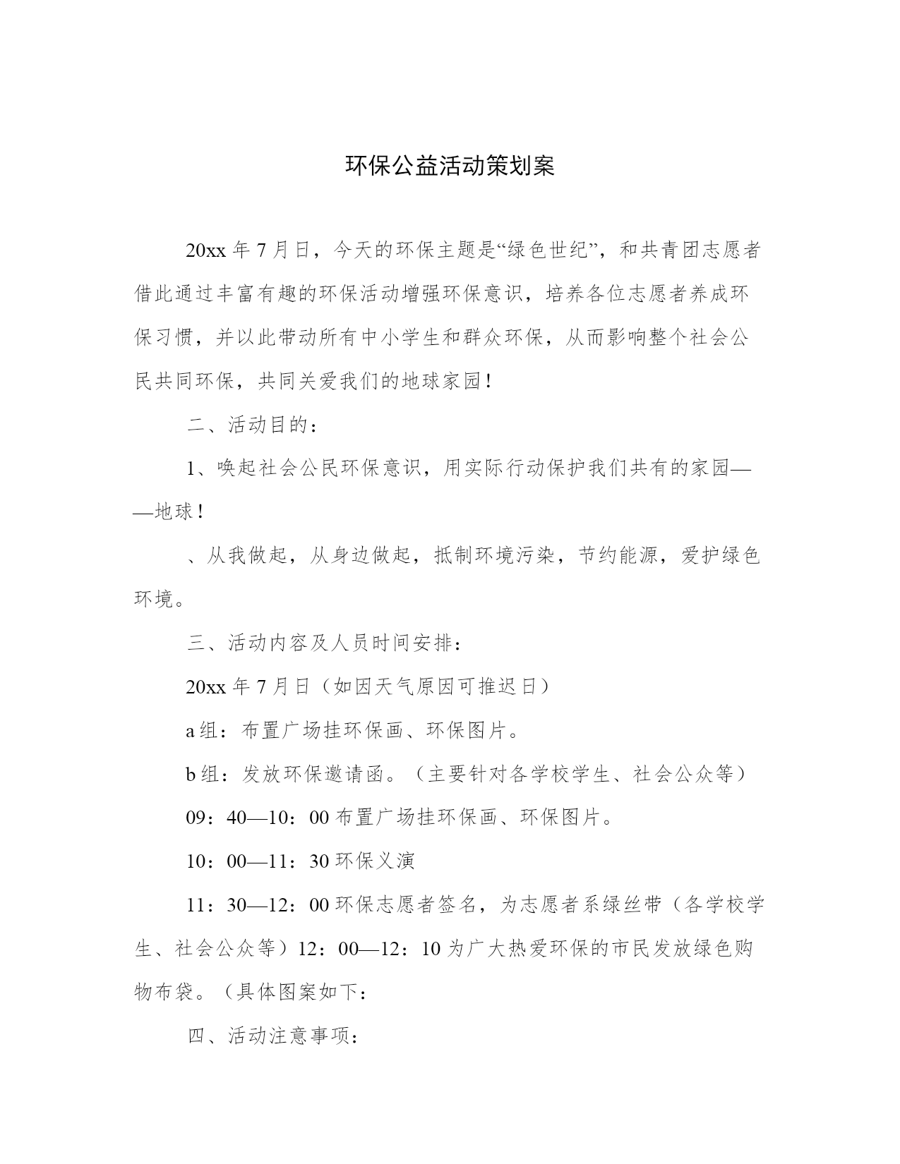 环保公益活动策划案20xx年7月日,今天的环保主题是“绿色世纪”,和共青团志愿者借此通过丰富有趣的环保活动增强环保意识,培养各位志愿者养成环保习惯,并以此带动所有中小学生和群众环保,从而影响整个社会公民共同环保,共同关爱我们的地球家园!二、活动目的:1、唤起社会公民环保意识,用实际行动保护我们共有的家园——地球!、从我做起,从身边做起,抵制环境污染,节约能源,爱护绿色环境。三、活动内容及人员时间安排:20xx年7月日(如因天气原因可推迟日)a组:布置广场挂环保画、环保图片。b组:发放环保邀请函。(主要针对