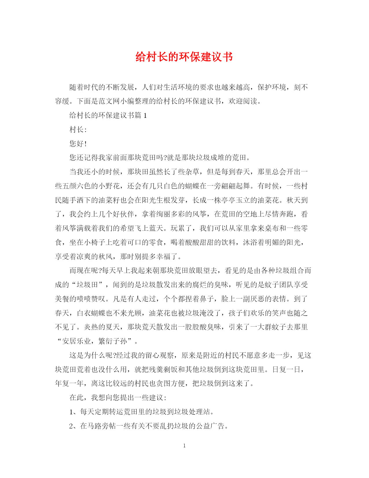 此资料由网络收集而来,如有侵权请告知上传者立即删除。资料共分享,我们负责传递知识。PAGEPAGE4给村长的环保建议书随着时代的不断发展,人们对生活环境的要求也越来越高,保护环境,刻不容缓。下面是范文网小编整理的给村长的环保建议书,欢迎阅读。给村长的环保建议书篇1村长:您好!您还记得我家前面那块荒田吗?就是那块垃圾成堆的荒田。当我还小的时候,那块田虽然长了些杂草,但是每到春天,那里总会开出一些五颜六色的小野花,还会有几只白色的蝴蝶在一旁翩翩起舞。有时候,一些村民随手洒下的油菜籽也会在阳光生根发