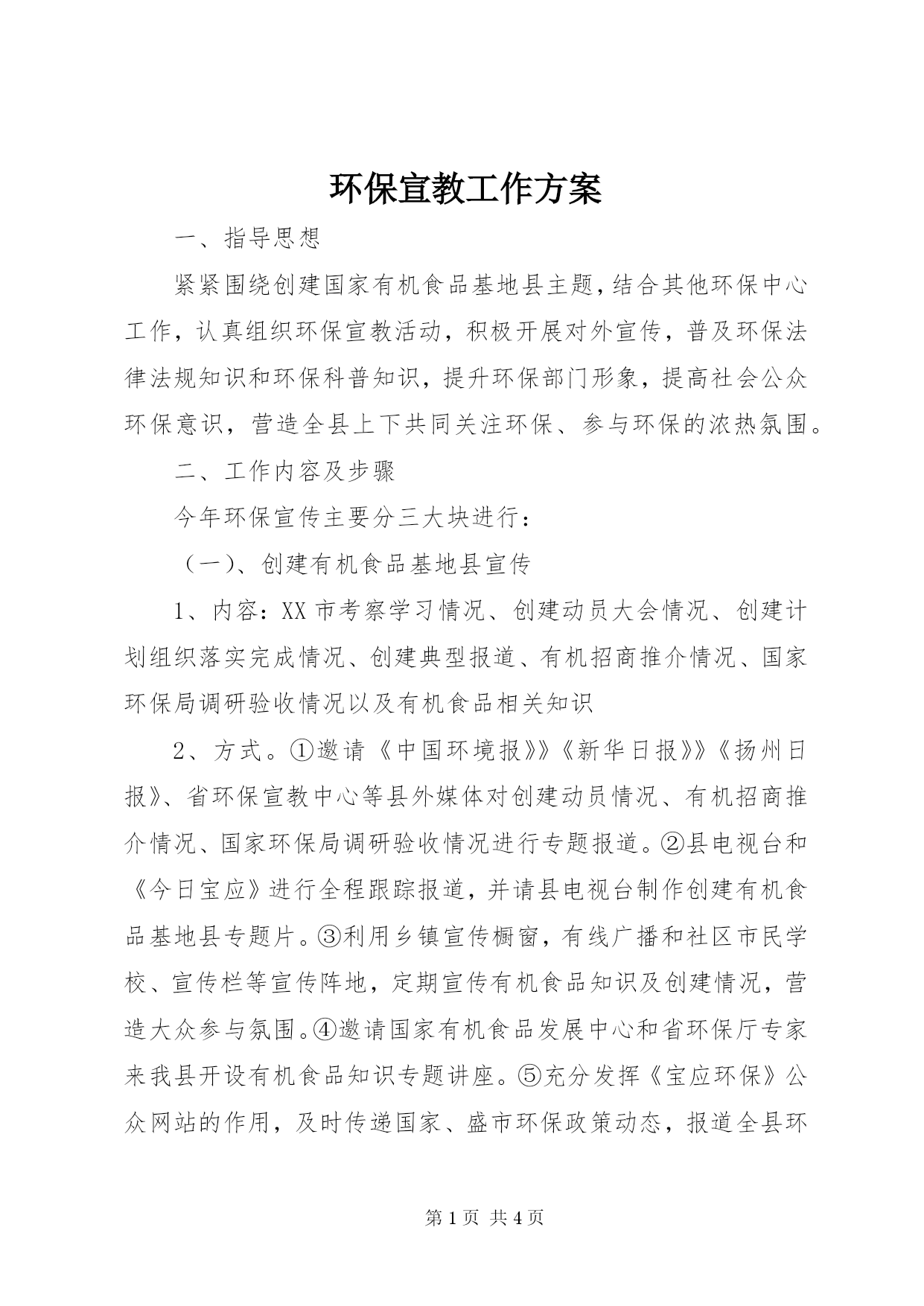 第PAGE\*Arabic\*MERGEFORMAT4页共NUMPAGES\*MERGEFORMAT4页环保宣教工作方案一、指导思想紧紧围绕创建国家有机食品基地县主题,结合其他环保中心工作,认真组织环保宣教活动,积极开展对外宣传,普及环保法律法规知识和环保科普知识,提升环保部门形象,提高社会公众环保意识,营造全县上下共同关注环保、参与环保的浓热氛围。二、工作内容及步骤今年环保宣传主要分三大块进行:(一)、创建有机食品基地县宣传1、内容:XX市考察学习情况、创建动员大会情况、创建计划组织落实完成