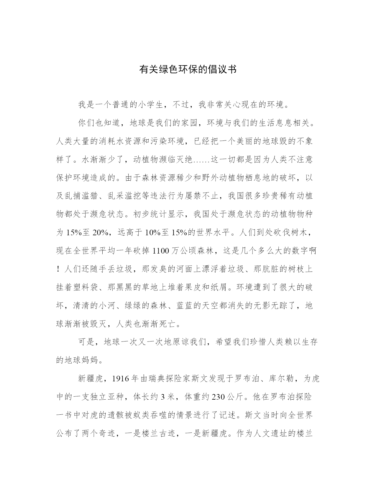 有关绿色环保的倡议书我是一个普通的小学生,不过,我非常关心现在的环境。你们也知道,地球是我们的家园,环境与我们的生活息息相关。人类大量的消耗水资源和污染环境,已经把一个美丽的地球毁的不象样了。水渐渐少了,动植物濒临灭绝……这一切都是因为人类不注意保护环境造成的。由于森林资源稀少和野外动植物栖息地的破坏,以及乱捕滥猎、乱采滥挖等违法行为屡禁不止,我国很多珍贵稀有动植物都处于濒危状态。初步统计显示,我国处于濒危状态的动植物物种为15%至20%,远高于10%至15%的世界水平。人们到处砍伐树木,现在全世界平均一