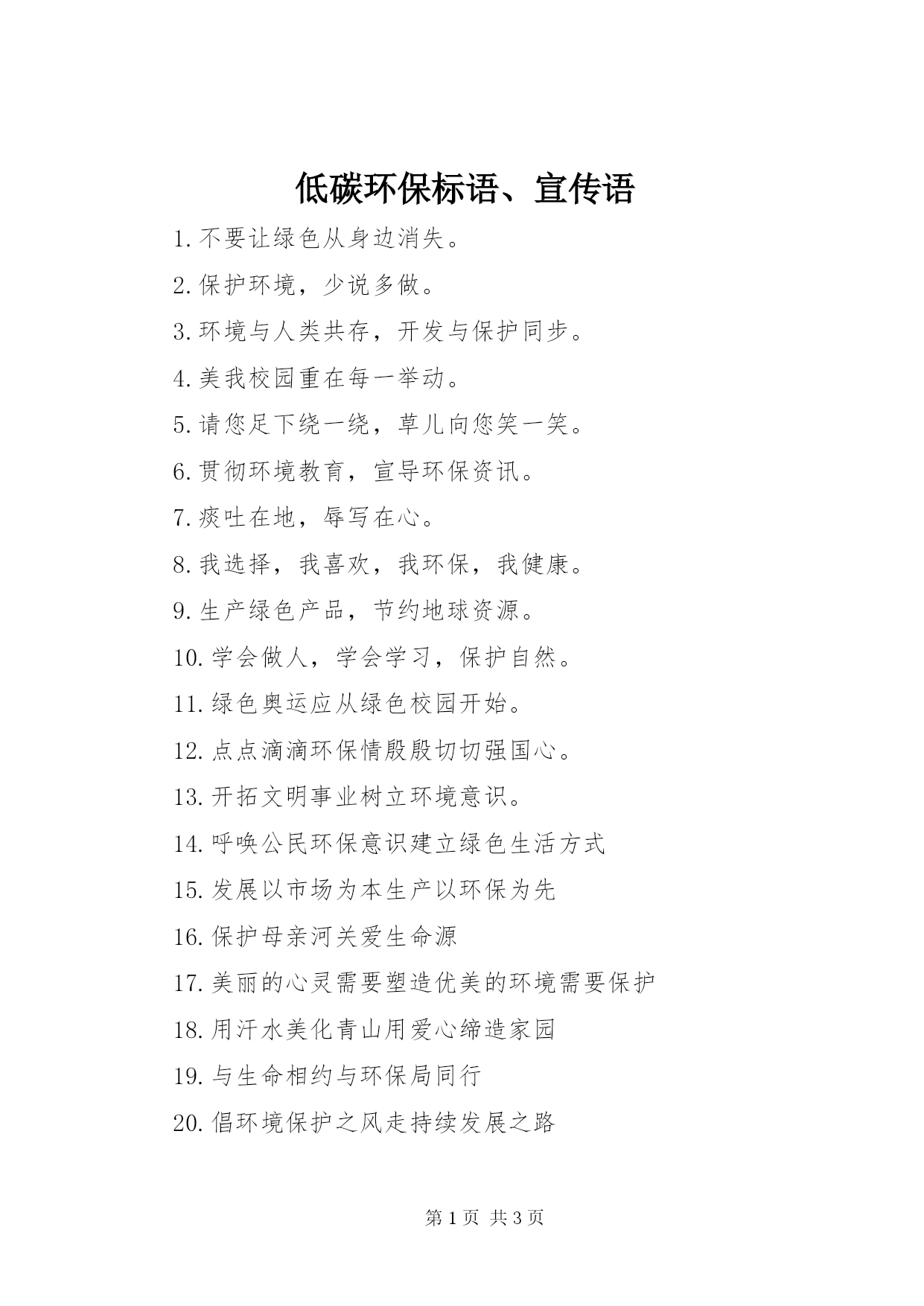 第PAGE\*Arabic\*MERGEFORMAT3页共NUMPAGES\*MERGEFORMAT3页低碳环保标语、宣传语1.不要让绿色从身边消失。2.保护环境,少说多做。3.环境与人类共存,开发与保护同步。4.美我校园重在每一举动。5.请您足下绕一绕,草儿向您笑一笑。6.贯彻环境教育,宣导环保资讯。7.痰吐在地,辱写在心。8.我选择,我喜欢,我环保,我健康。9.生产绿色产品,节约地球资源。10.学会做人,学会学习,保护自然。11.绿色奥运应从绿色校园开始。12.点点滴滴环保情殷殷切切强国心