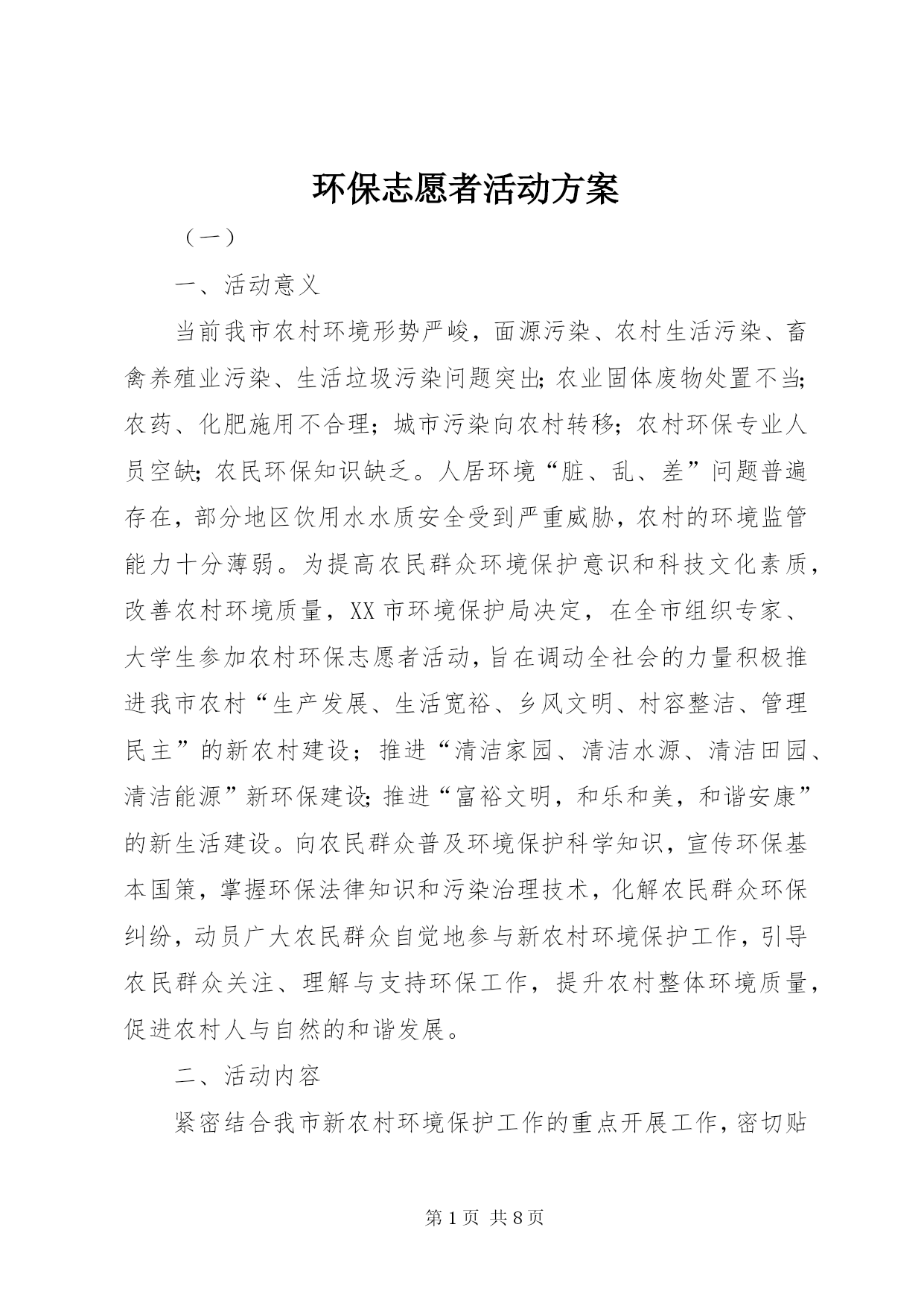 第PAGE\*Arabic\*MERGEFORMAT8页共NUMPAGES\*MERGEFORMAT8页环保志愿者活动方案(一)一、活动意义当前我市农村环境形势严峻,面源污染、农村生活污染、畜禽养殖业污染、生活垃圾污染问题突出;农业固体废物处置不当;农药、化肥施用不合理;城市污染向农村转移;农村环保专业人员空缺;农民环保知识缺乏。人居环境“脏、乱、差”问题普遍存在,部分地区饮用水水质安全受到严重威胁,农村的环境监管能力十分薄弱。为提高农民群众环境保护意识和科技文化素质,改善农村环境质量,XX市